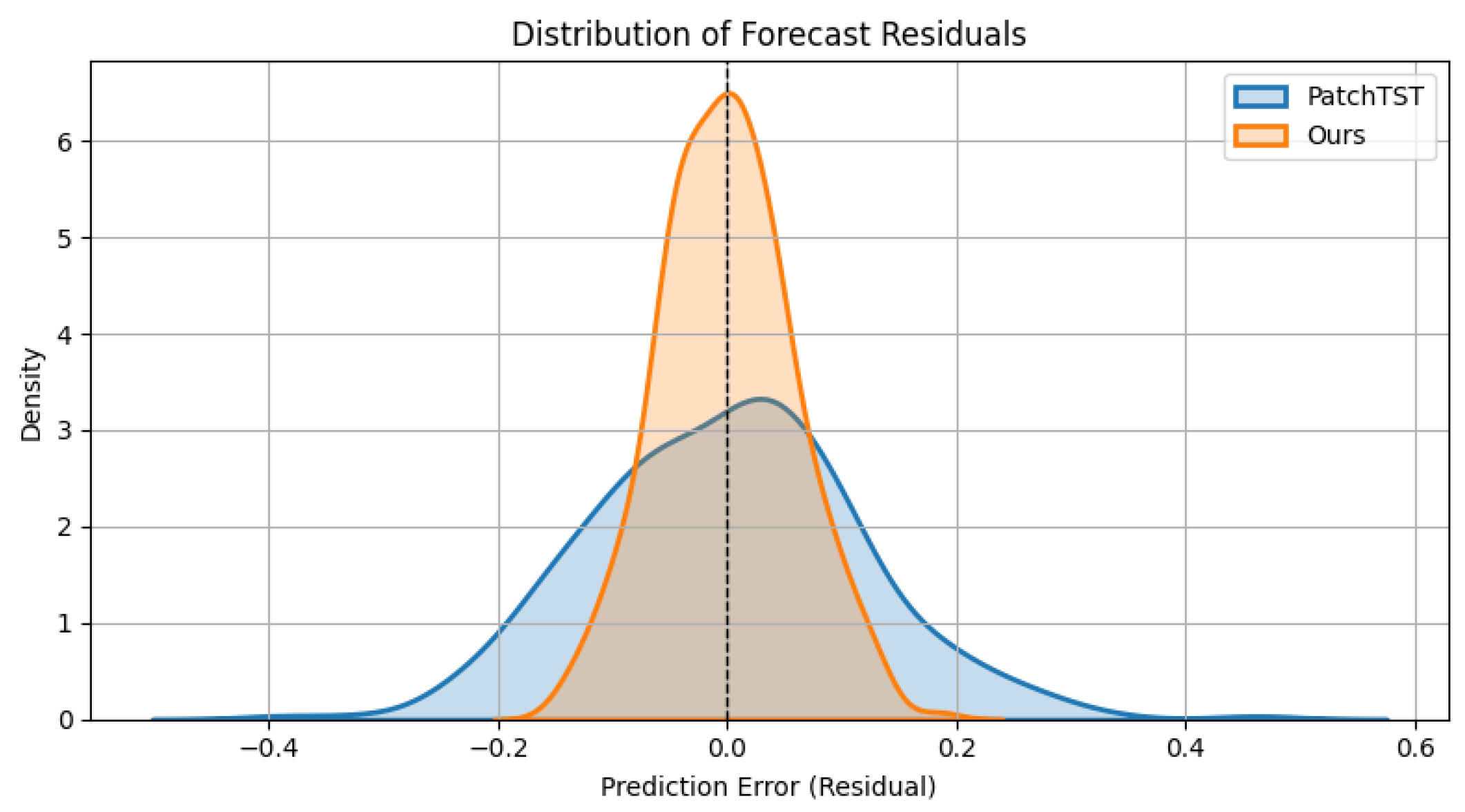 Figure 6, which presents the residual distributions of PatchTST and our model. Although both residual series are centered around zero, indicating no systematic bias, the distribution for our model is significantly narrower and more sharply peaked. This suggests reduced variance in prediction errors and a lower frequency of extreme deviations. A Kolmogorov–Smirnov test confirms that the difference in residual dispersion between the two models is statistically significant (