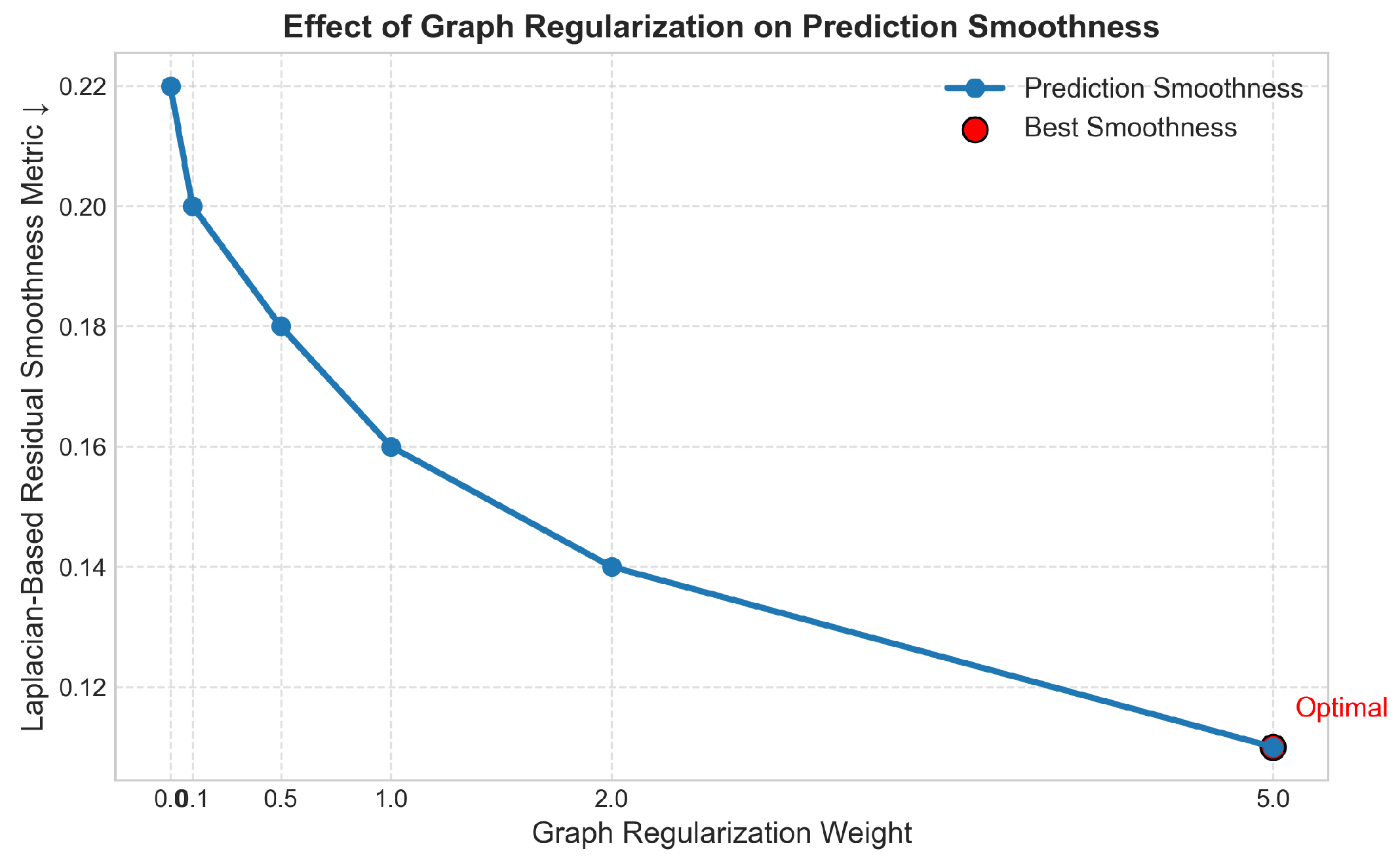 Figure 8 illustrates the relationship between the strength of the graph regularization term and the smoothness of prediction residuals over the underlying data graph. Smoothness is quantified using local variance or Laplacian-based metrics over graph neighborhoods, reflecting the consistency of model predictions across spatially or semantically linked nodes (e.g., geographic regions, event clusters, and user segments). As the regularization coefficient increases, residuals become progressively smoother across the graph structure, indicating enhanced consistency and spatial coherence in model predictions. This validates the role of the proposed graph regularization strategy in mitigating overfitting to isolated patterns and promoting generalizable learning across structurally similar instances. Importantly, this trend affirms the hypothesis that incorporating domain-specific graph priors (such as shared market dynamics, location-based similarities, or operational dependencies) into the training objective not only improves in-distribution accuracy but also fosters structure-aware robustness. Over-regularization (beyond a certain threshold) may lead to performance degradation due to excessive smoothing, thus emphasizing the importance of regularization weight tuning.