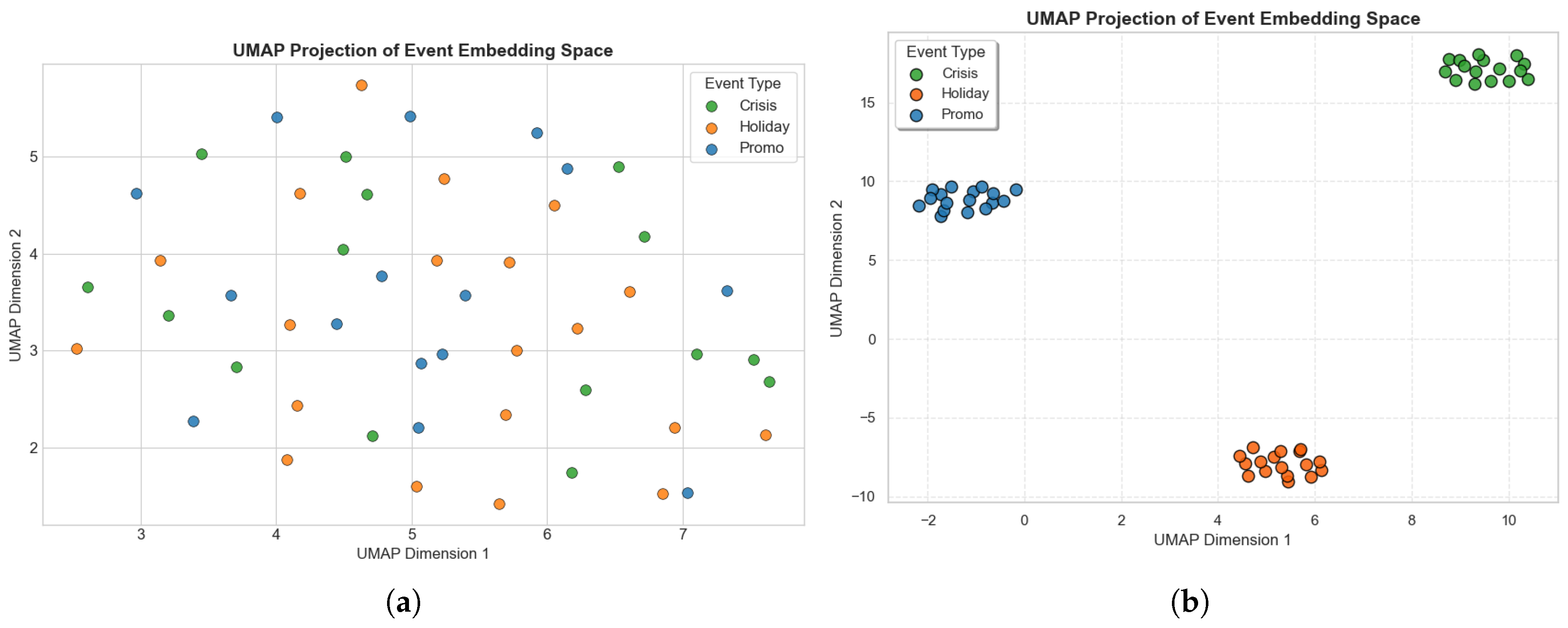 Figure 9 visualizes the semantic space of event-related embeddings using uniform manifold approximation and projection (UMAP), a nonlinear dimensionality reduction technique optimized for preserving local and global manifold structures. High-dimensional embeddings of 50 events are projected into two dimensions, which are color-coded by event category. The visualization reveals well-separated clusters for each event type, confirming the success of the event embedding module in capturing latent distinctions, especially tighter clustering for crisis events, reflecting their distinct impact patterns.