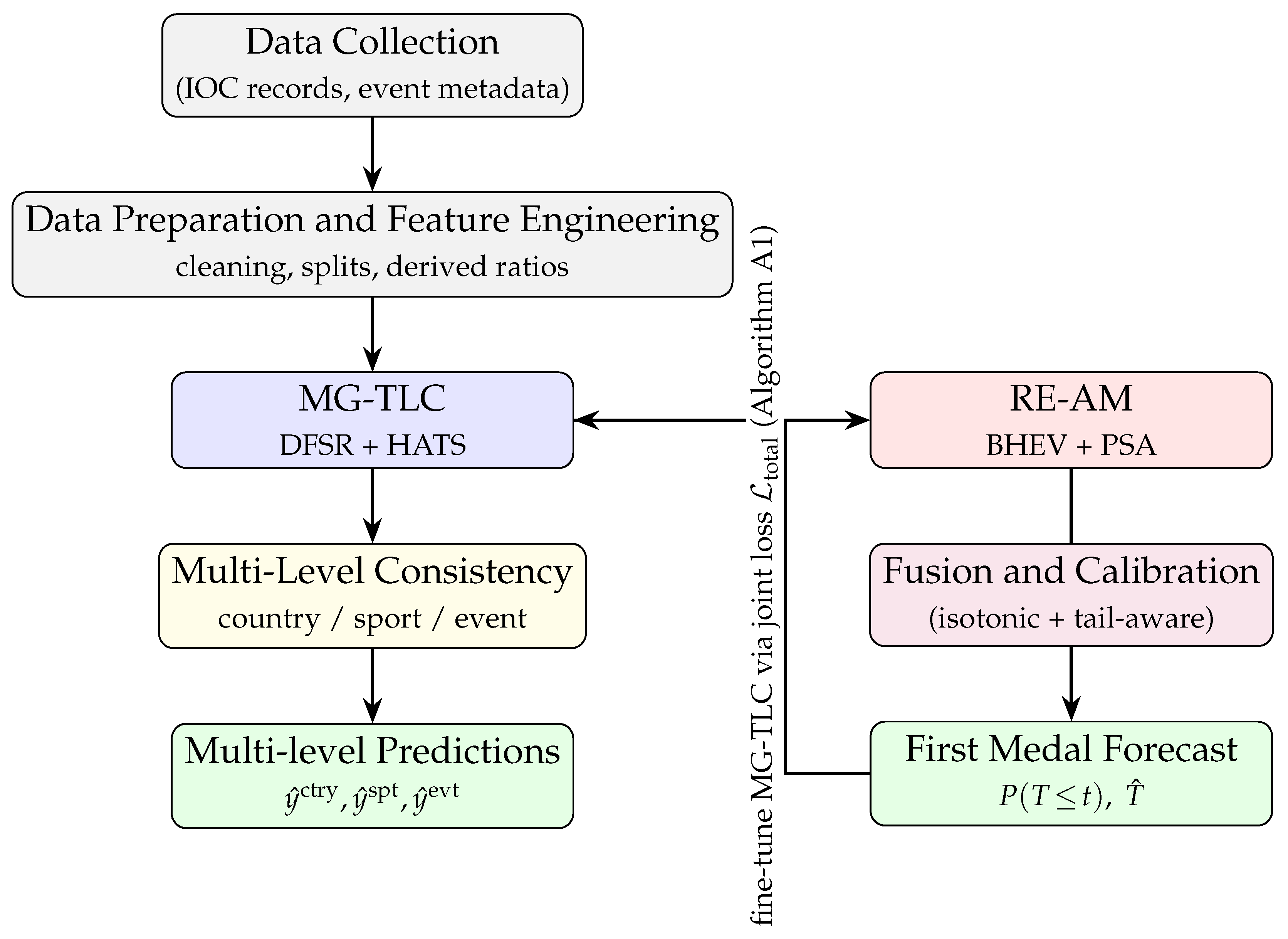 1. Independent Training Stage: Separately train country-level, sport type-level, and event-level prediction models to obtain initial prediction results , , and .