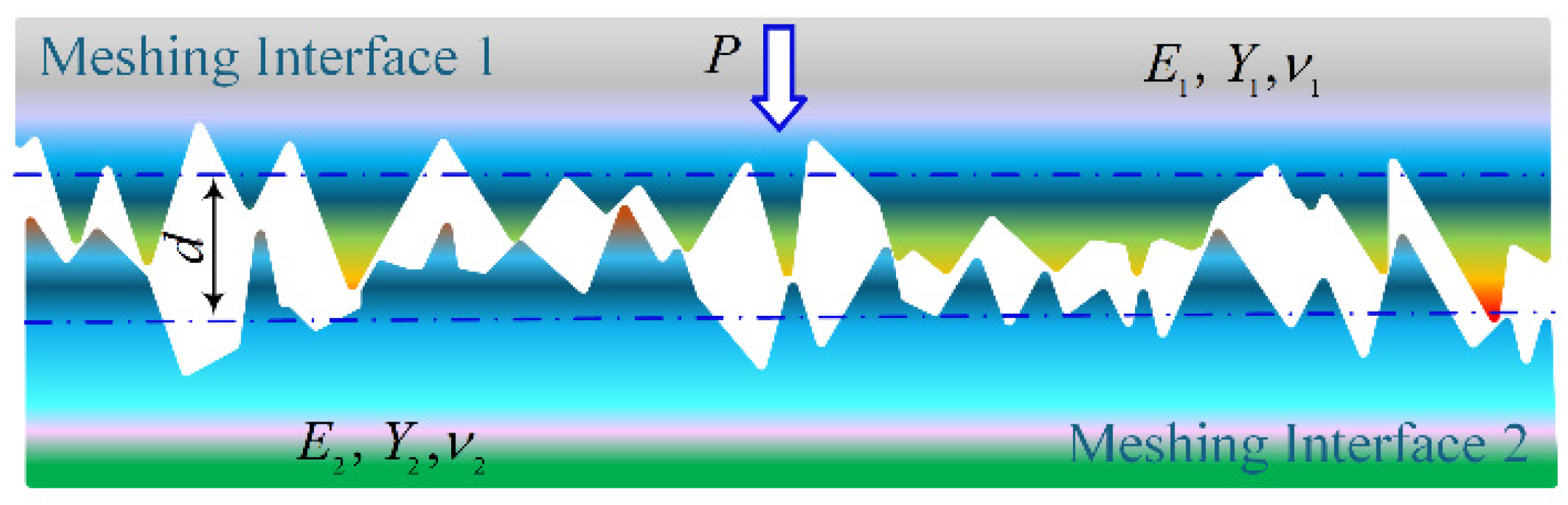 Figure 1. In the study of meshing interface mechanics, it is essential to incorporate the deformation of micro-asperities with the multi-scale characterization of the contact interface. As mentioned earlier, the contact interface of two fractal surfaces can be modeled using Equations (1)–(3). The model typically employs fractal parameters that dominate the power spectrum of the contact surface within a target frequency or specific wavelength range, and often adopts a multifractal description approach. Based on this, the problem can be simplified under the action of the global surface interference amount