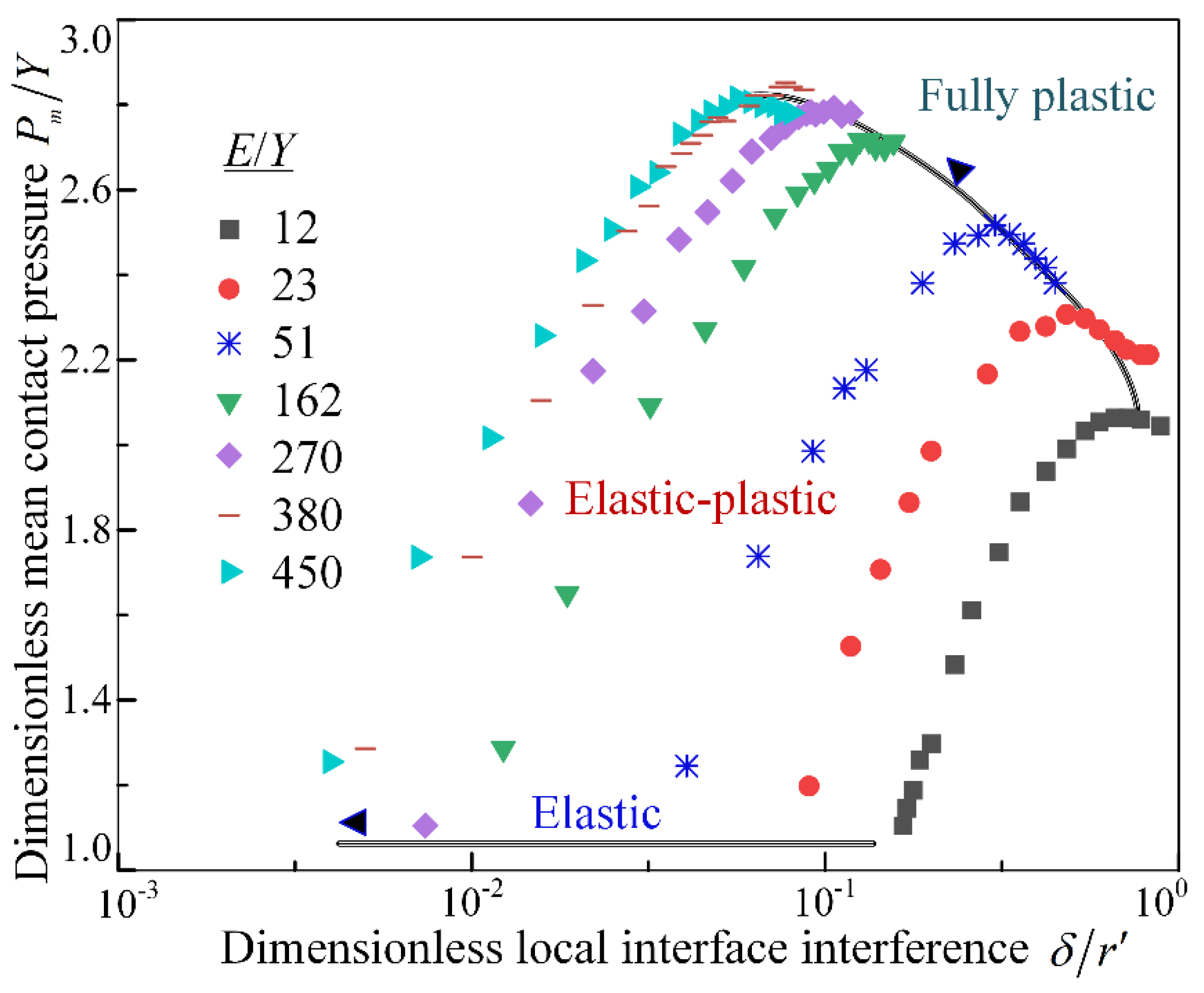 11]. In the realm of elastoplastic contact theory, scholars have conducted in-depth analyses of the mechanical responses of isotropic strain-hardening and non-hardening elastoplastic half-spaces under cyclic loading by spherical indenters, obtaining for the first time an exact interfacial mechanical solution for the first loading cycle in the perfectly plastic contact deformation stage. Based on extensive numerical calculations, the research team has mapped out characteristic diagrams of average contact pressure versus deformation mechanisms, covering elastic, perfectly plastic, and elastic-hardening materials [
