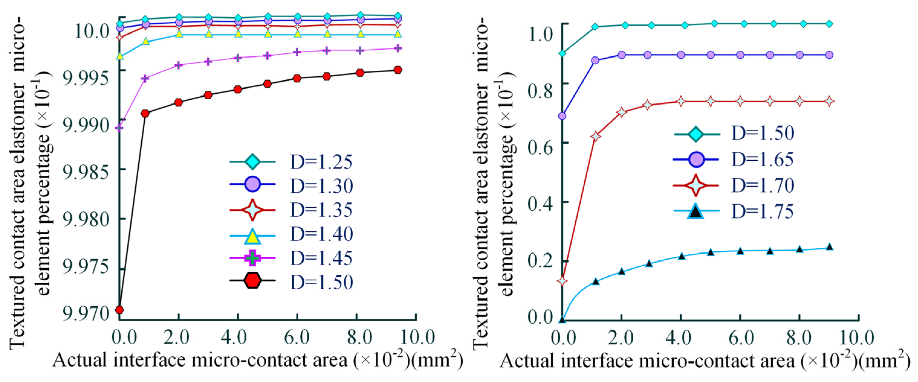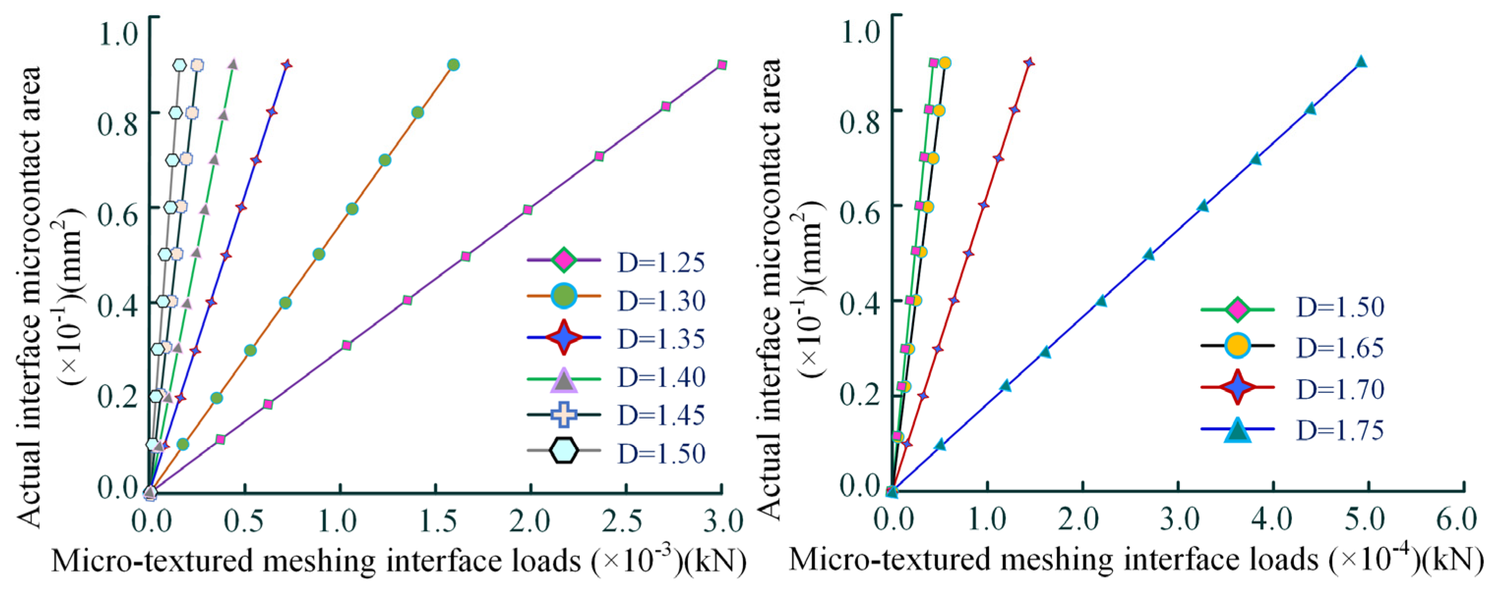 The relationship between the contact load of textured micro-elements and the actual interfacial contact area in the meshing region is analyzed via MATLAB simulations across a range of fractal dimensions [