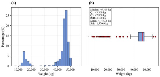 Distribution analysis of vehicle weight data. (a) Histogram showing the percentage distribution of vehicle weights with 30 bins; (b) box plot displaying the statistical summary including the median, quartiles, and outliers.