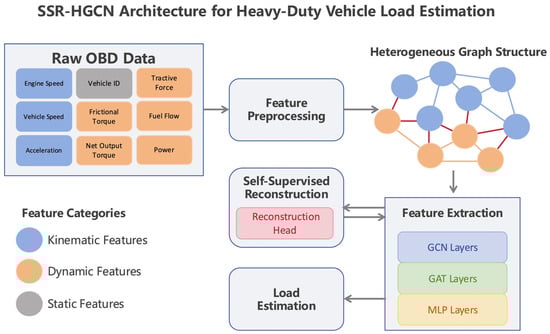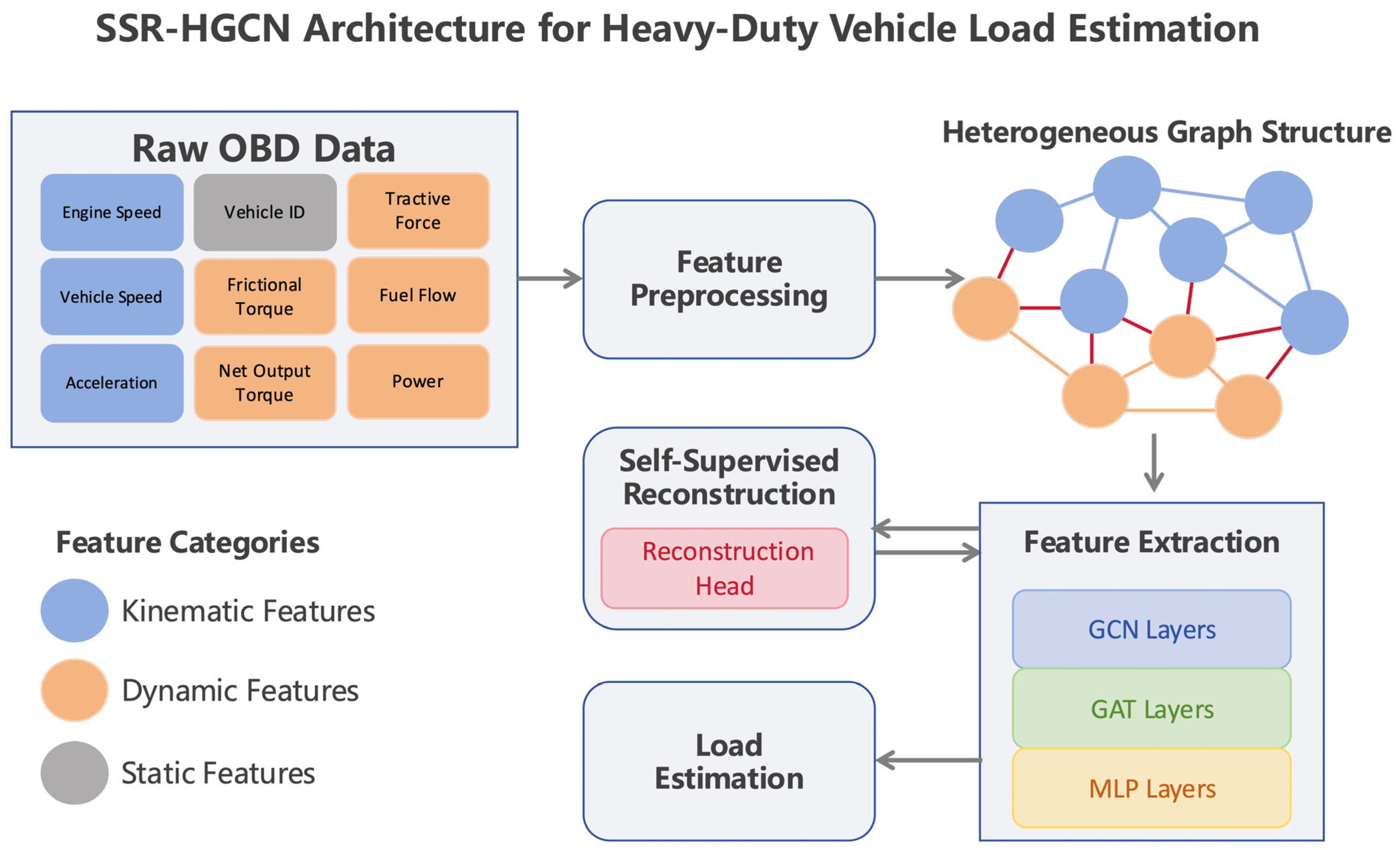 To bridge this gap, this paper proposes a Self-Supervised Reconstruction Heterogeneous Graph Convolutional Network (SSR-HGCN), a novel framework designed for robust and accurate load estimation based on raw OBD data. Our approach is founded on three key innovations that directly address the aforementioned limitations: