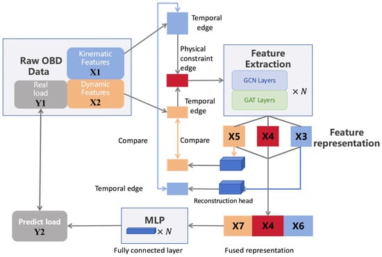 Building upon the self-supervised reconstruction module and graph neural network described above, we categorized OBD parameters into two groups: kinematic features (vehicle speed, engine speed, and acceleration) and dynamic features (engine torque, friction torque, fuel flow, power, and traction) for heavy-duty vehicle load estimation. To capture the temporal interactions between kinematic and dynamic features that influence vehicle load, we proposed the SSR-HGCN model, which enforces physical constraints through cross-domain message passing between kinematic and dynamic features.
