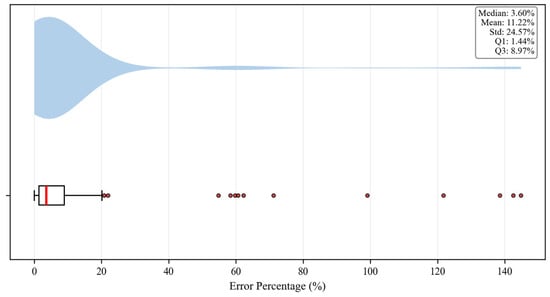 By calculating the proportion of test set samples with prediction errors below specific thresholds, we quantitatively evaluated each model’s overall fitting performance. As shown in Table 7 and Figure 9, a total of 19.62% of samples have prediction errors less than 1%, with over 90% of samples having errors less than 15%.