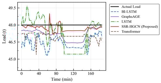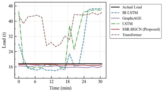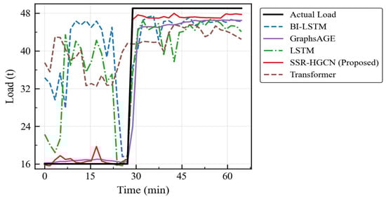 Similarly, SSR-HGCN outperforms the Transformer model, reducing RMSE by 33.21% and MAPE by 26.57%. Although the Transformer’s self-attention mechanism is powerful for capturing long-range sequential dependencies, it still lacks an explicit understanding of the underlying vehicle dynamics. It may identify spurious correlations in the time series without grounding them in physical principles. In contrast, the SSR-HGCN’s graph structure forces the model to learn representations that are consistent with the physical laws of motion, leading to better generalization and accuracy, especially in dynamic situations like the load-change scenario (Table 11 and Figure 12).