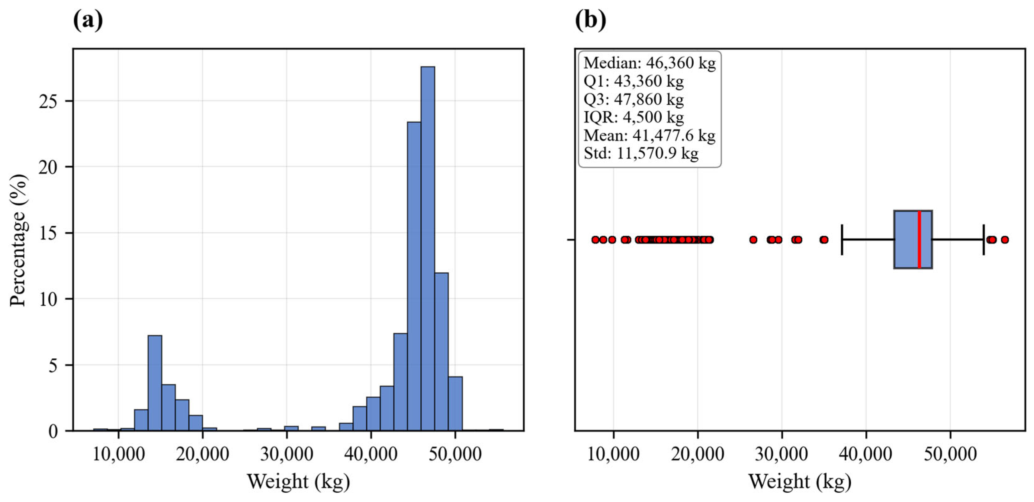Figure 1, the main distribution interval of the original load data concentrates at 40–48 t, directly reflecting the prevalence of 6-axle heavy-duty vehicle loads under full-load scenarios; the low-proportion interval at 10–25 t on the left corresponds to the typical load characteristics of empty states and return cargo scenarios. Further analysis of the box plot shows a median load of 44 t, with most experimental samples being 42–46 t.