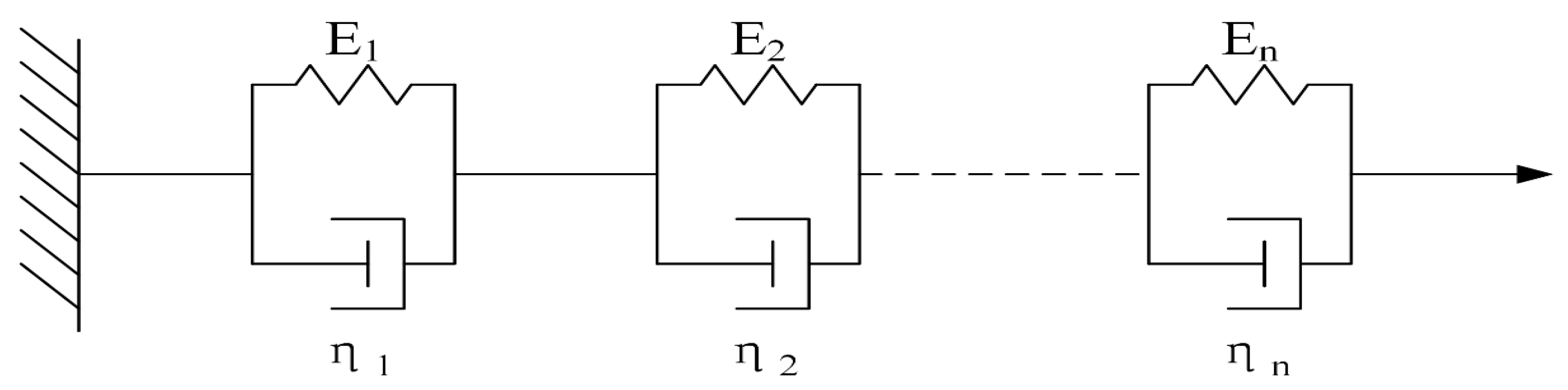 For linear viscoelastic materials, the material properties are only functions of time, not of stress or strain. The creep compliance (J) represents the strain response to a unit step stress and varies with time. By applying the Laplace transform [18] to the generalized Kelvin–Voigt mechanical model, the creep compliance (J) can be divided into a time-independent elastic component J0 and a time-dependent creep function J(t). The specific expression of the creep function for the generalized Kelvin–Voigt mechanical model is as follows:
