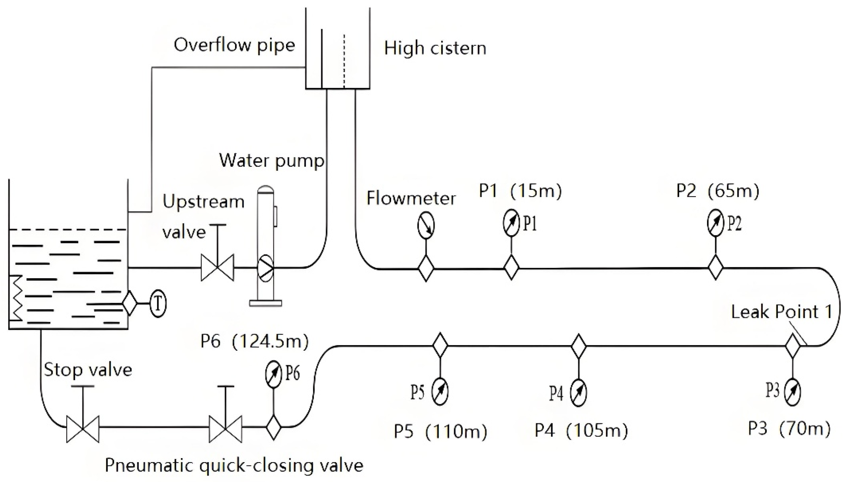 Other scholars have focused on leakage detection methods based on numerical modeling. Early researchers typically used the time-domain method to solve traditional water hammer models and then used optimization methods to solve the objective function for leak localization. Chahardah-Cherik Parvin et al. [4] performed experimental and numerical studies on polyethylene pipeline networks using the method of characteristics in the time domain and proposed that the viscoelasticity of the pipeline wall leads to pressure signal attenuation, increased head loss, and phase shift under partial blockage. Furthermore, they determined the location and characteristics of blockages of different sizes using ITA in the time domain. Lazhar et al. [5] solved a mathematical model using the method of characteristics in the time domain and conducted research on the detection and localization of double leaks. The results showed that this method can determine the location and size of leaks by analyzing the reflection characteristics of pressure waves, and that factors such as the viscoelasticity of the pipeline wall, leak location, leak size, and friction influence the behavior of pressure signals.