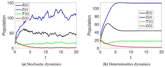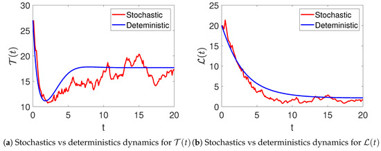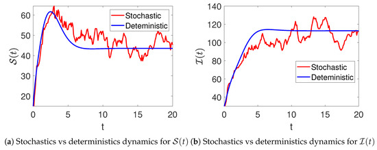 In Figure 1, the stochastic and deterministic dynamics of various state variables of the model (2) are visualized. Figure 2a shows the dynamics of the susceptible women, and Figure 2b demonstrates the behavior of infected women. It can be observed that there is an increase at the beginning of the simulations, resulting in a significant wave, followed by a decrease in their number. Similarly, the infections are seen to increase with time, as shown in Figure 2b. Furthermore, Figure 3a,b aim to present the dynamics in both stochastic and deterministic senses of the women under treatment and those who have recovered from the disease. In this observation, it is evident that the count within the treatment group decreases rapidly, followed by an increase in the number of patients receiving treatment. The number of recovered individuals decreases over time.