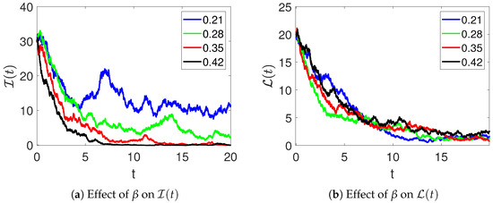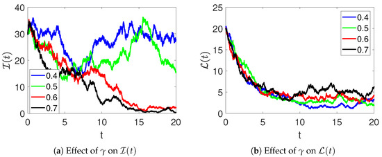 Furthermore, the effects of the parameter on the dynamics of and are demonstrated in Figure 5. Here, it can be observed that the number of infections decreases, and the number of recoveries increases as the rate of treatment is increased. Figure 6 shows the effects of medical therapy () on infected and recovered individuals. The infected women recover faster as increases. Likewise, an increase in the number of women who recover is observed as more of them receive medical therapy.