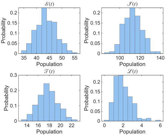 The histograms portraying the distribution of population levels from multiple stochastic simulations of the proposed model.