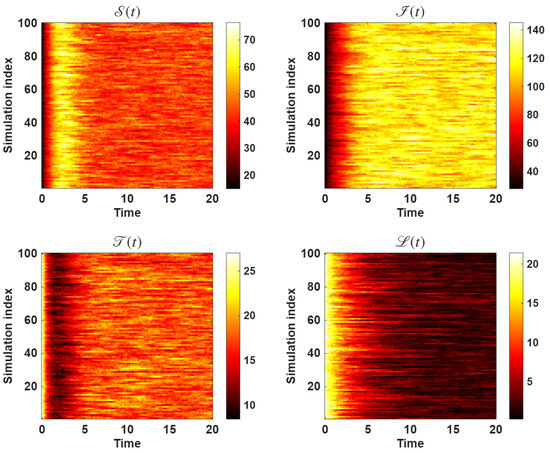 Figure 8 displays the corresponding heatmaps showing the spatio-temporal evolution of population levels across multiple simulation runs. Each pixel encodes the population level at a specific time and simulation index, with the color intensity indicating the magnitude of the population density. The heatmaps reveal the temporal stability and random fluctuations of the system, illustrating how each compartment evolves under the influence of stochastic effects. Together, these plots provide a comprehensive visualization of variability and the long-term statistical stability of the model.