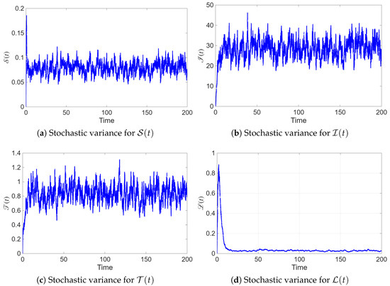 Figure 9 illustrates the temporal evolution of the stochastic variance for the four compartments of the model. The variance of (patients undergoing treatment) is notably higher than that of the other compartments, indicating that the infected population is the most sensitive to random fluctuations in treatment and recovery dynamics. In contrast, and exhibit relatively low variance, suggesting that the susceptible and recovered classes remain more stable over time. These results align with the biological expectation that variability in treatment response and hormonal regulation primarily affects women under therapy rather than those in the recovered or susceptible states. Overall, the system tends toward a steady stochastic equilibrium, confirming the boundedness of random fluctuations around the mean trajectories.