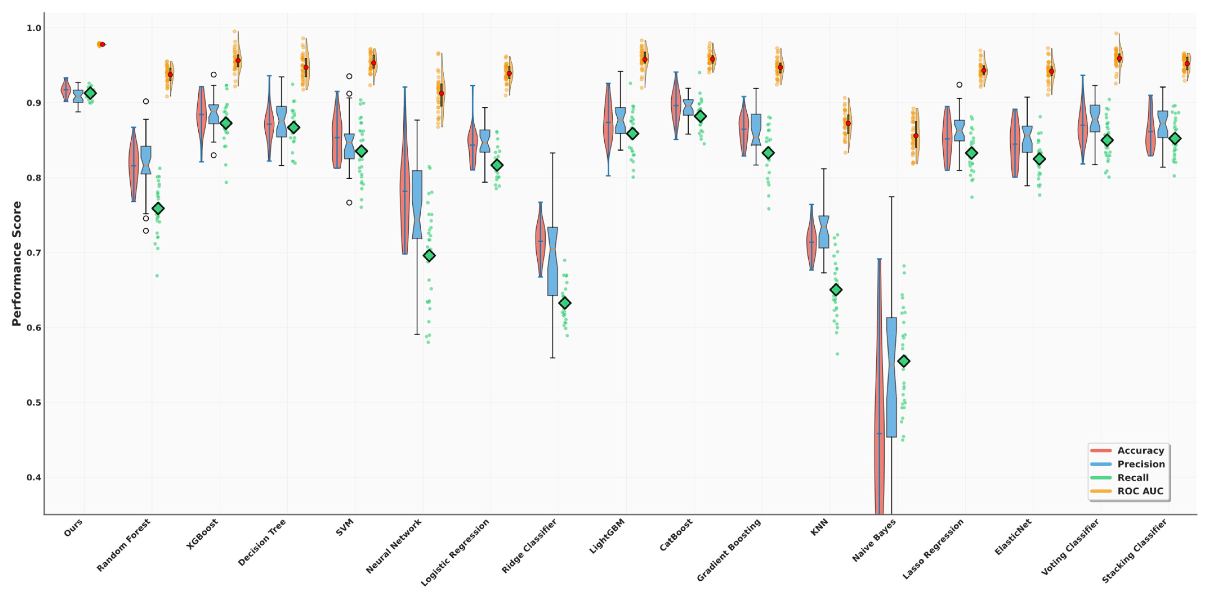 - Advanced imbalance handling through BorderlineSMOTE with conservative balancing strategy preventing over-synthesis while preserving original data distribution characteristics;