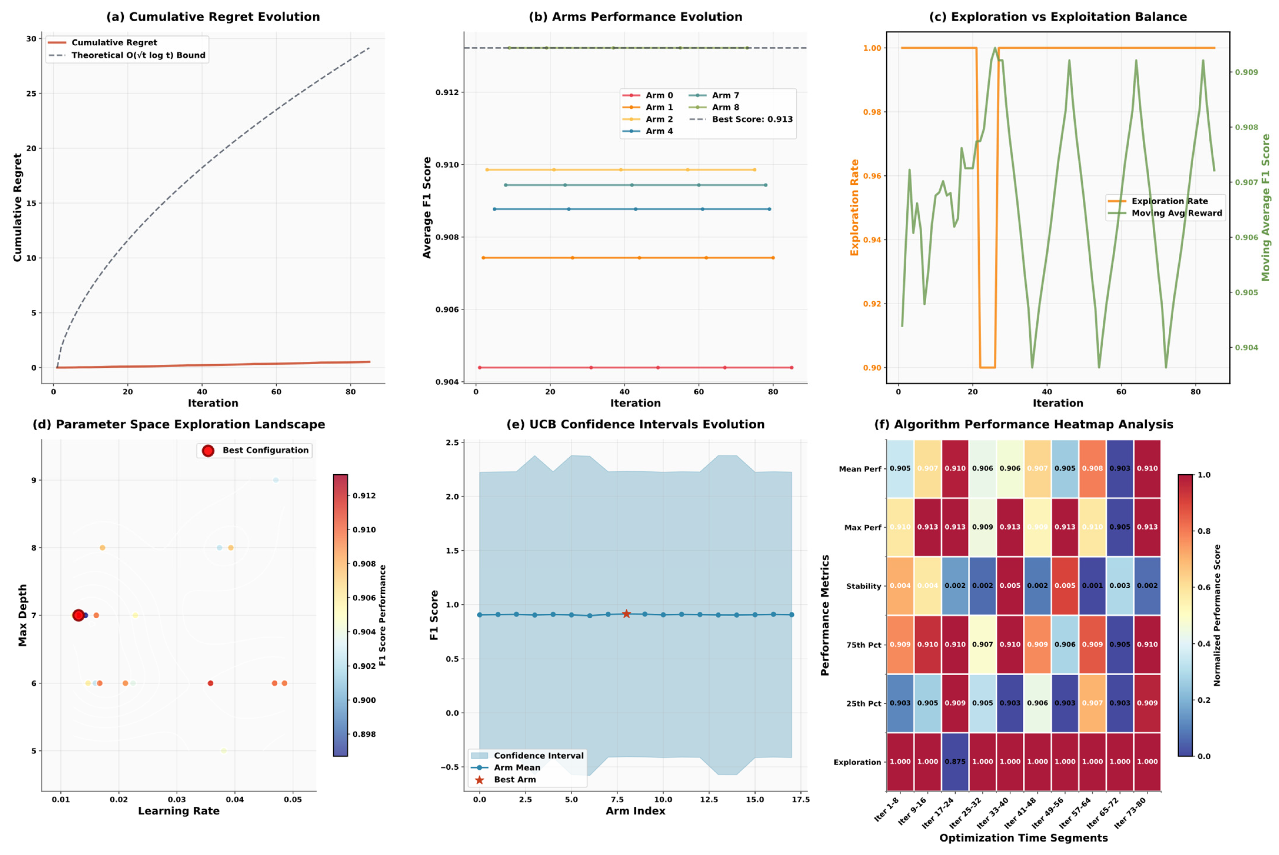 - A unified adaptive bandit approach that merges XGBoost with Upper Confidence Bound exploration for intelligent hyperparameter search, achieving 0.9-fold to 9.7-fold time efficiency improvement over four hyperparameter optimization methods;