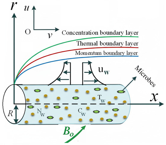 Haq et al. [16] studied the transfer of heat and stagnation flow of a hybrid nanofluid in the direction of a stretched cylinder while subjected to mixed convection and a magnetic field. The impacts of Soret and Dufour have been used for investigating the 2-D radiative heat transfer of second-grade fluid flow across a stretched cylinder [17]. They observe that concurrent fluctuations of Soret and Dufour have an inverse correlation with heat and mass transfer rates. Using the Soret-Dufour parameter, Ramzan et al. [18] examine a permeable stretched cylinder. Activation energy and mobile motile microorganisms are described in relation to the bioconvection incompressible flow of nanofluid. Additionally, Brownian motion and thermophoresis parameters are being studied [19].