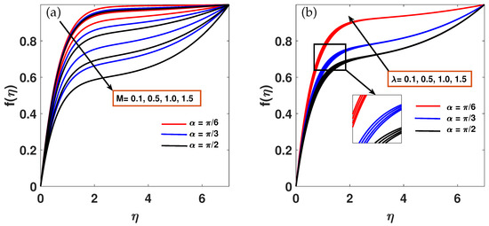 The influence on the thermal distribution , momentum profile , the concentration distribution , and motile profile with skin coefficient, , , and are shown using graphs and tables. Figure 2a,b describe the fluctuation of velocity profile with magnetic parameter M and mixed convection parameter with simultaneous effect of . The fluid’s velocity profile decreases in the case of the magnetic parameter, whereas improves it. Physically, the mixed convection parameter is the ratio of buoyant to inertial forces; hence, a greater indicates a higher thermal buoyancy force, which improves velocity profiles. Also when rises, the dimensionless velocity decreases. This is due to the fact that the Lorentz force, a resistive force to fluid flow, is connected to the magnetic parameter, and the magnetic effect gets stronger as rises. The velocity decreases as the magnetic parameter rises because greater resistive force is applied.