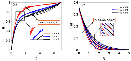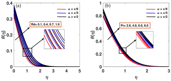 Figure 4a,b show the inspiration of radiation factor and Prandtl number alongside acting concurrently on hybrid nanofluid fluid temperature profile. The increasing incidence in the nanofluid temperature profile demonstrated in Figure 4a can be seen by an increase in the radiation factor . From a physical perspective, when the radiation parameter increases, the fluid discharges heat energy from the flow area, enhancing the nanofluid’s temperature and cooling the system. Heat is added to the system as the radiation parameter increases, and more heat is added when the thermal boundary layer is thicker. Since the mean absorption coefficient falls as K1 rises, the thermal field rises as well. Therefore, in order to cool more effectively, heat radiation should be minimized. The effect of the Prandtl number on the temperature of nanoparticles is seen in Figure 4b. The ratio of two numbers, momentum and thermal diffusivity, is known as the Prandtl number, which is a non-dimensional quantity. As increases, thermal diffusivity decreases, resulting in a further decrease in the temperature and thickness of the boundary layer.