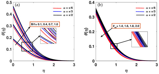 Figure 5a,b demonstrate that an increase in the Biot number and the wall temperature parameter leads to a rise in the nanofluid temperature profile with a simultaneous effect of MHD. Physically, higher Bi indicates a greater ratio of convective heat transfer to thermal conductivity, leading to elevated temperature within the fluid. When the Biot number is low, the internal thermal resistance of the solid is negligible compared to surface resistance, resulting in a nearly uniform solid temperature and making enhancements to surface convection the most effective design strategy. When the Biot number is high, internal thermal resistance dominates, causing significant temperature gradients within the solid and making it essential to enhance internal thermal conductivity. Additionally, as increases, the temperature profile continues to rise, a trend consistently observed across all inclination angles .