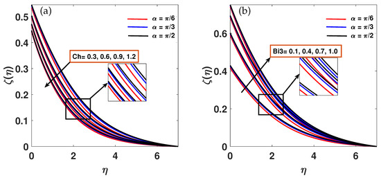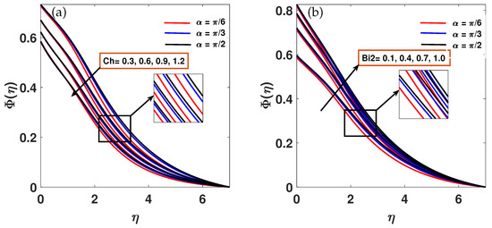 The consequences of the chemical reaction and convective parameter on concentration profile with a parallel effect of is shown in Figure 6a,b. High values cause the reaction rate and molecular diffusivity to rise, which lowers the concentration profiles of nanoparticles. Higher chemical reaction parameter values are associated with a drop in the concentration profile, while the concentration profile is enhanced by the concentration convective parameter . Figure 7a,b depicts the features of the motile profile involving the chemical reaction parameter and motile concentration convective parameter with simultaneous effect of inclination MHD. As increases, motile concentration falls, as shown in Figure 8a. However, the motile concentration profile rises together with the convective parameter parameter. Physically, the strength of chemical reactions that can change local concentration gradients and either increase or decrease microbe activity is represented by the parameter . Due to stronger response consumption, a higher typically results in a lower motile density. In the meantime, convective mass transfer at the boundary is characterized by , where a higher improves the movement of microorganisms from the fluid’s surface. These factors work together to control the dispersion of microorganisms and the stability of bioconvection.