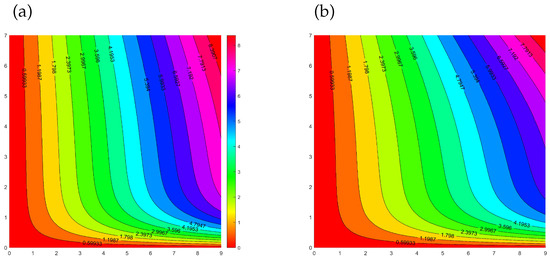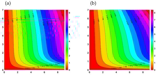 The stream functions and are dimensionless, and the stream function typically satisfies Equation (1). Employing the previously indicated similarity vectors (7), the nonlinear partial differential Equations (2)–(5) are transformed as follows: