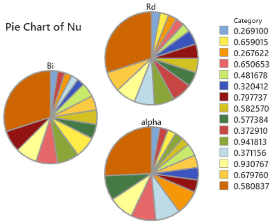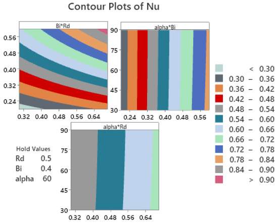 The Nusselt number distribution in a hybrid nanofluid as impacted by the parameters , , and , as shown in a pie chart in Figure 10. The figure illustrates the combined effects of these parameters on the efficiency of heat transmission in hybrid nanofluids, with different sections highlighting their respective contributions to improved thermal performance in engineering applications. A residual plot of the Nusselt number distribution in AlO3-Cu/water hybrid nanofluids is shown in Figure 11. The distribution indicates improved convective heat transfer, with Nu rising above base fluids as a result of boundary layer thinning and thermal conductivity increases brought on by nanoparticles. In Figure 12 the contour map shows how the radiation parameter Rd, Biot number Bi, and inclined MHD interact collectively to affect the local Nusselt number, which is the measure of heat transport at the surface. Heat transport decreases as magnetic damping increases with magnetic field strength and inclination. The Nusselt number is raised by higher Rd values because they increase temperature gradients and thermal radiation. Heat transport is also improved by a higher Bi, which indicates stronger convective surface heating.