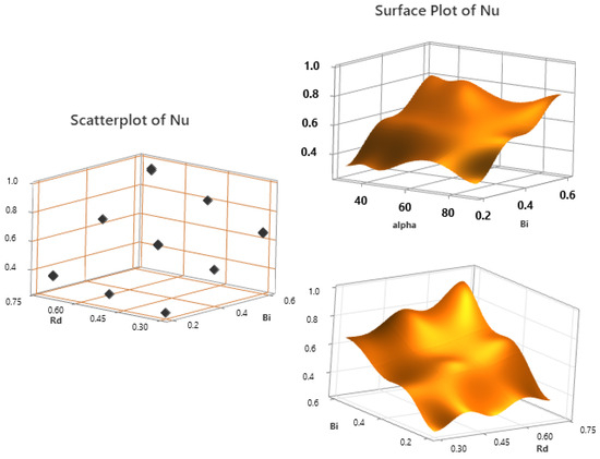 Scatter plot and surface plots depicting for different values of Rd, Bi and .