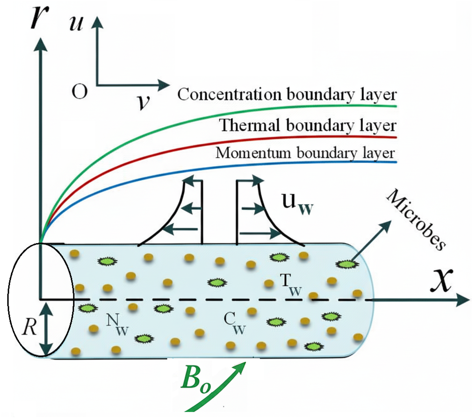 - Galal, A.M.; Zeemam, M.; Imran, M.; Basit, M.A.; Tahir, M.; Akram, S.; Younis, J. Numerical exploration of bioconvection in optimizing nanofluid flow through heated stretched cylinder in existence of magnetic field. Multidiscip. Model. Mater. Struct. 2025, 21, 425–447. [Google Scholar] [CrossRef]