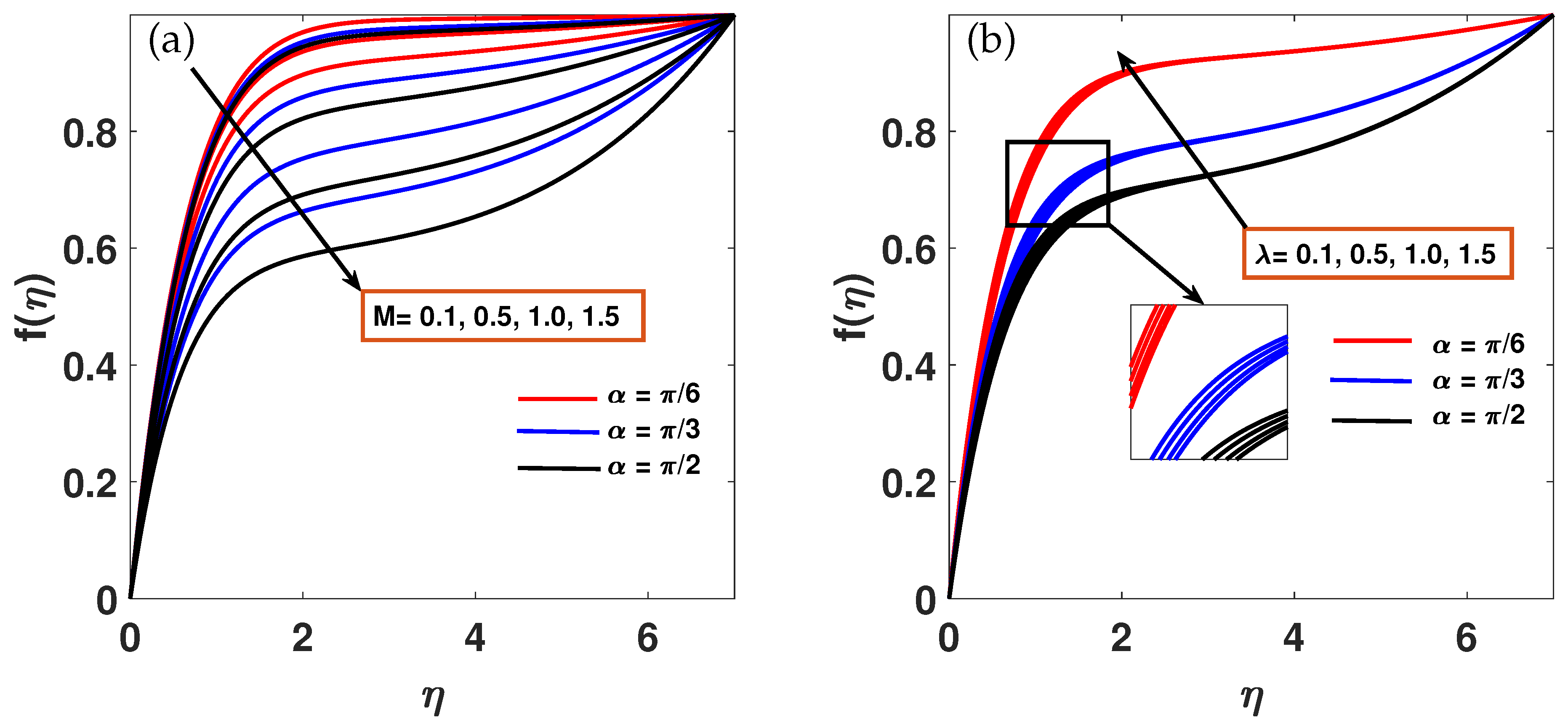 - The streamline graph illustrates the way fluid flow is affected simultaneously by the magnetic parameter M and an angled magnetic field.