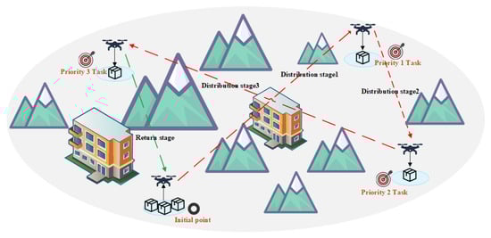 As shown in Figure 1, a drone takes off from a starting point, carrying emergency supplies, and first flies to a priority 1 area to drop the supplies. The drone then flies to priority 2 and priority 3 destinations. After completing the delivery mission, the drone returns to the starting point from the last destination. This research model is based on the following assumptions:
