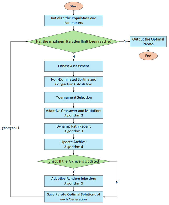 The overall process is shown in Figure 2, which clearly demonstrates the key steps such as population initialization, iterative update, adaptive crossover and mutation, dynamic path repair and elite retention, and demonstrates the algorithm’s adaptive ability in multi-objective optimization under complex constraints:
