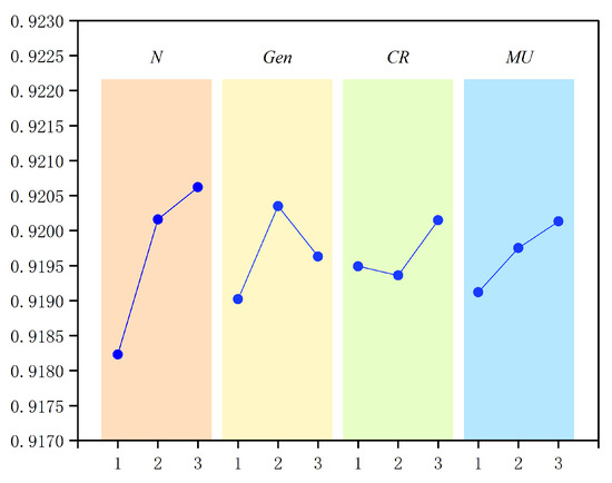 We analyze the average ODS value for each group and plot the parameter results in a line chart, as shown in Figure 4. This chart shows the impact of different parameter combinations on the optimization results. By observing the average ODS value for each parameter (N, Gen, CR, MU), we can select the optimal parameter combination. The higher the ODS, the better the optimization results. Therefore, when selecting parameters, it is generally recommended to choose a combination with a higher ODS value, as this indicates that the algorithm performs better with that parameter combination and is more likely to achieve the optimization goal. From the trend of the line in the experimental results, we can also see that increasing the population size has a positive effect on the optimization in the specific scenario of this study. However, considering the low complexity of the task model and the small scale of the problem, in order to save computing resources and time while ensuring the optimization effect, I chose a relatively small population size parameter. This choice can not only obtain sufficient optimization results within a reasonable time range, but also effectively reduce the computing cost and avoid unnecessary computing overhead caused by an overly large population. Therefore, no experimental discussion on a larger population was conducted.