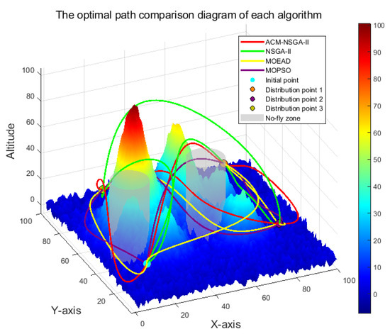Figure 5 and Figure 6 shows the UAV paths generated by different algorithms under the same complex terrain, obstacle, and no-fly zone configuration. Among all methods, the ACM-NSGA-II algorithm generates the most reasonable path. The path closely follows the terrain contours, maintains a safe altitude margin, and generates the smoothest and most coherent route based on flight inertia. This minimizes energy consumption and flight time while avoiding collisions with obstacles, meeting the objectives of emergency logistics. This path demonstrates good flexibility and stability when traversing narrow feasible corridors and bypassing complex obstacles. The generated trajectory is smooth and continuous, with high search accuracy and adaptability to constraints. In contrast, the path generated by the standard NSGA-II algorithm is overly conservative, maintaining a large distance from obstacles and no-fly zones. While ensuring feasibility, this increases path length and energy consumption, resulting in reduced planning efficiency. The path generated by the MOPSO algorithm also exhibits some fluctuations, with some sections slightly winding, while others are overly conservative, maintaining a large distance from obstacles and no-fly zones, resulting in reduced planning efficiency. The trajectory generated by the MOEA/D algorithm exhibits significant fluctuations, large turns, and frequent vertical deviations, resulting in an unstable path structure, which may affect the continuity and dynamic feasibility required for practical UAV flight control.