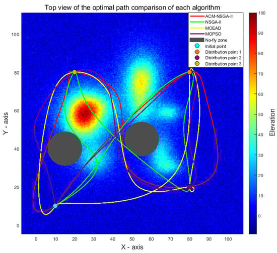 The no-fly zones are rendered in a nearly transparent color to facilitate visual inspection of the drone’s flight path when flying behind them, avoiding blind spots. In order to provide a more comprehensive presentation, Figure 6 shows the global optimal paths generated by the four algorithms in a typical run from a top view. In the top-down view, the no-fly zones are darker in color because, from a bird’s-eye view, the nearly transparent no-fly zones are difficult to distinguish from the surrounding terrain. Therefore, the darker color was chosen to distinguish them. However, Figure 5 and Figure 6 show the same no-fly zone.