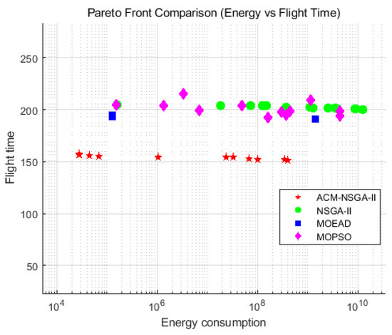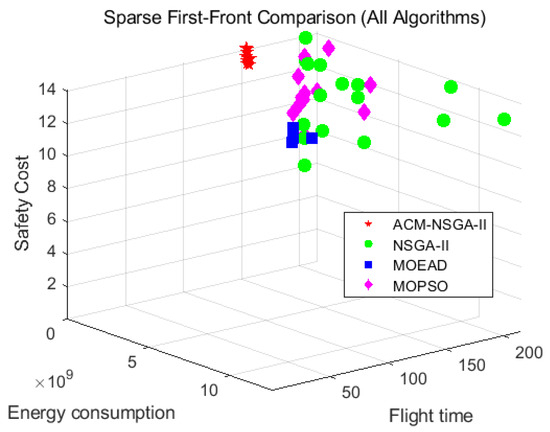 To further compare the solution distribution characteristics of the proposed algorithm with those of mainstream multi-objective optimization methods, Figure 7 shows the Pareto first-level solutions obtained by ACM-NSGA-II, MOPSO, MOEA/D, and NSGA-II in a single independent run. The three optimization objectives are safety cost, flight time, and energy consumption with a penalty term.