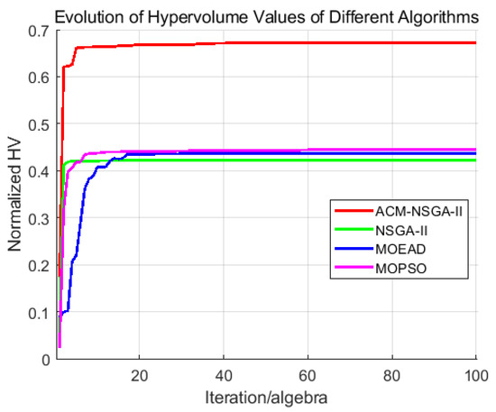 Figure 9 shows the normalized hypervolume evolution curves of each algorithm in a single representative run. The ACM-NSGA-II curve (red) generally outperforms NSGA-II (green), MOEA/D (blue), and MOPSO (magenta). Overall, the SCM-NSGA-II algorithm exhibits excellent convergence from the very beginning and quickly stabilizes within approximately 20 iterations. Around iteration 30, the convergence results shift slightly upward, ultimately stabilizing the hypervolume value at around 0.67. This result significantly outperforms the other three algorithms, demonstrating its superior performance in terms of solution accuracy and breadth of distribution. In contrast, the standard NSGA-II algorithm showed a convergence trend initially, but gradually plateaued with increasing iterations, with the optimal hypervolume value stabilizing at around 0.43. This reflects its susceptibility to local optima and limited optimization capabilities. The MOPSO algorithm also exhibited rapid convergence early on, but plateaued after approximately 20 generations, ultimately stabilizing its hypervolume value at around 0.44. The MOEA/D algorithm also exhibited early convergence, reaching a plateau at approximately 20 generations and rising slightly at approximately 30 generations.