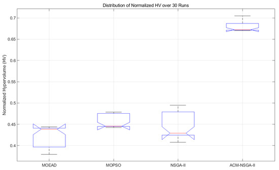 A statistical significance test is a statistical method used to assess whether sample data supports a hypothesis. This test can determine whether an observed effect or difference in the sample data is likely due to chance, or whether there is sufficient evidence to support the existence of the effect or difference. To further evaluate the statistical significance of the performance advantage of the proposed ACM-NSGA-II algorithm, this study conducted two-sample t-tests and Mann–Whitney U tests on the normalized hypervolume values obtained from 30 independent runs at a 5% significance level. Furthermore, this study used boxplots to visualize the distribution of algorithm performance, as shown in Figure 10. The blue box used in the figure represents the outer frame of the box plot, and the red line represents the median of the data. The shape of the blue box shows the interquartile range of the data, and the black horizontal line represents the extreme values of the data.