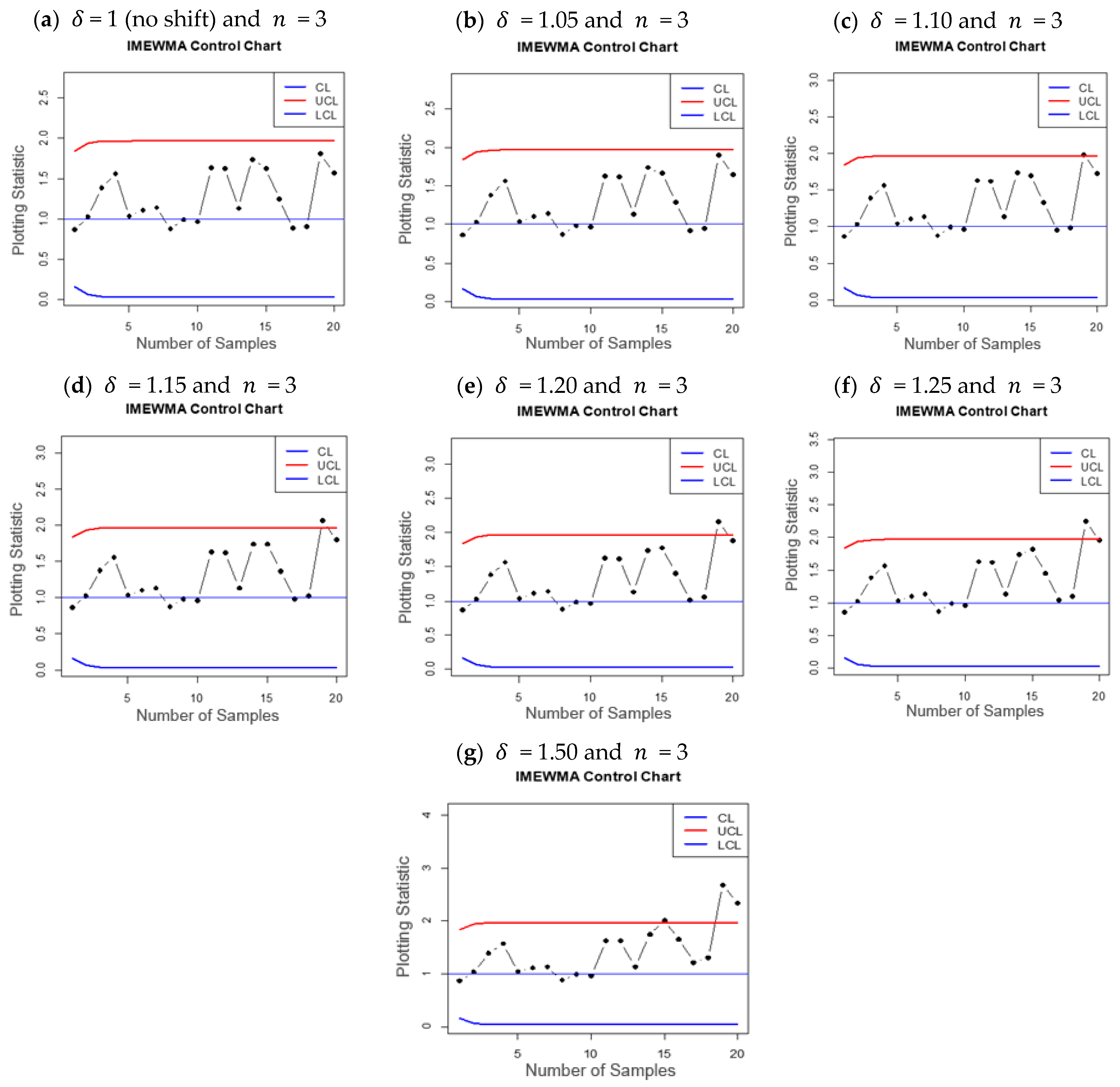- For smaller shifts (e.g., 1.01 to 1.05), the IMCUSUM chart consistently outperforms the IMEWMA chart, even for larger subgroup sizes ( = 6, 9).