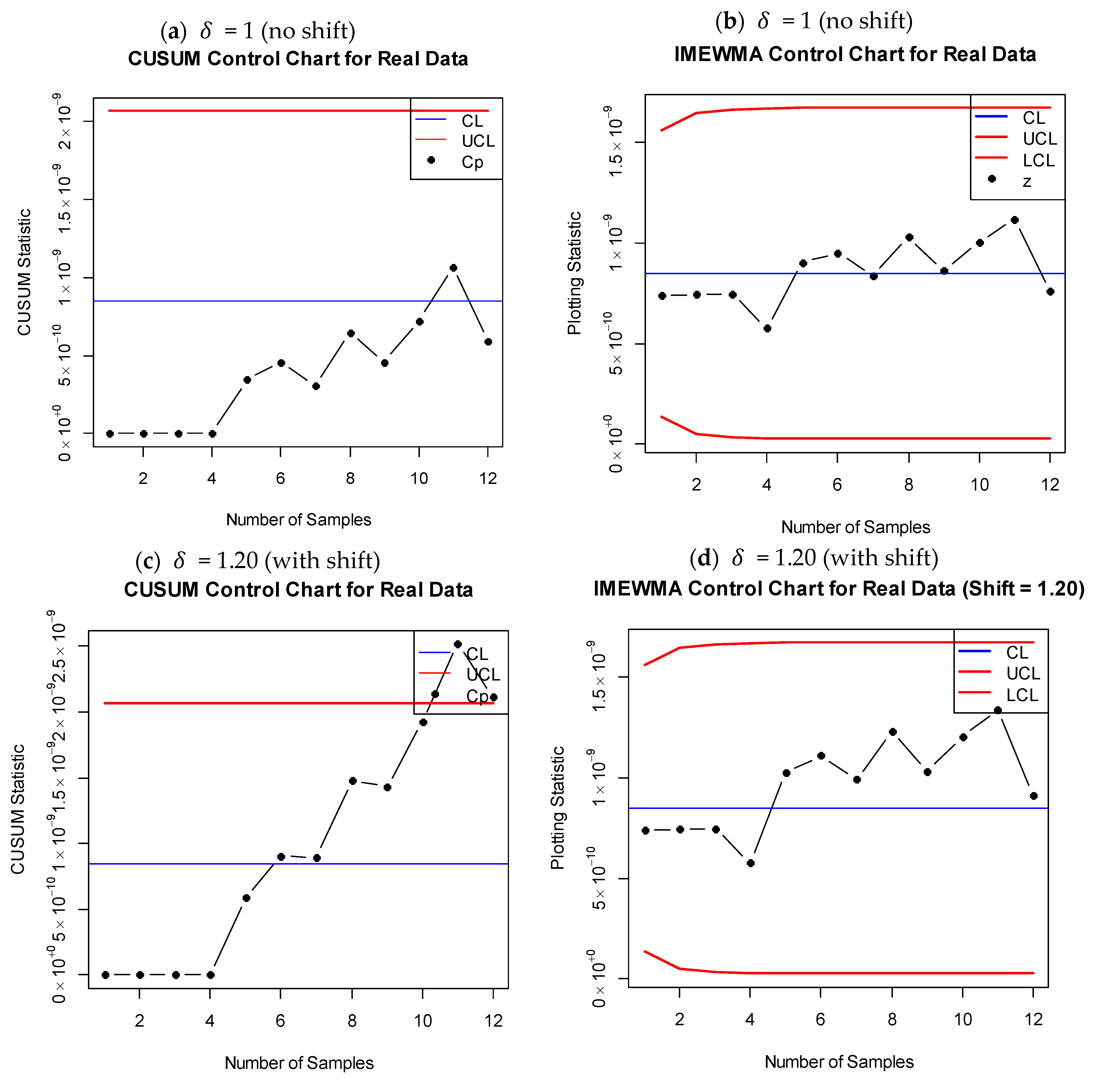 - For both the IMCUSUM and IMEWMA charts, the ARL0 values are approximately 370 across all subgroup sizes ( = 1, 3, 6, 9). This indicates that, under IC conditions, both charts produce an out-of-control signal, on average, at every 370th plotted point, which aligns with the nominal ARL0 target.