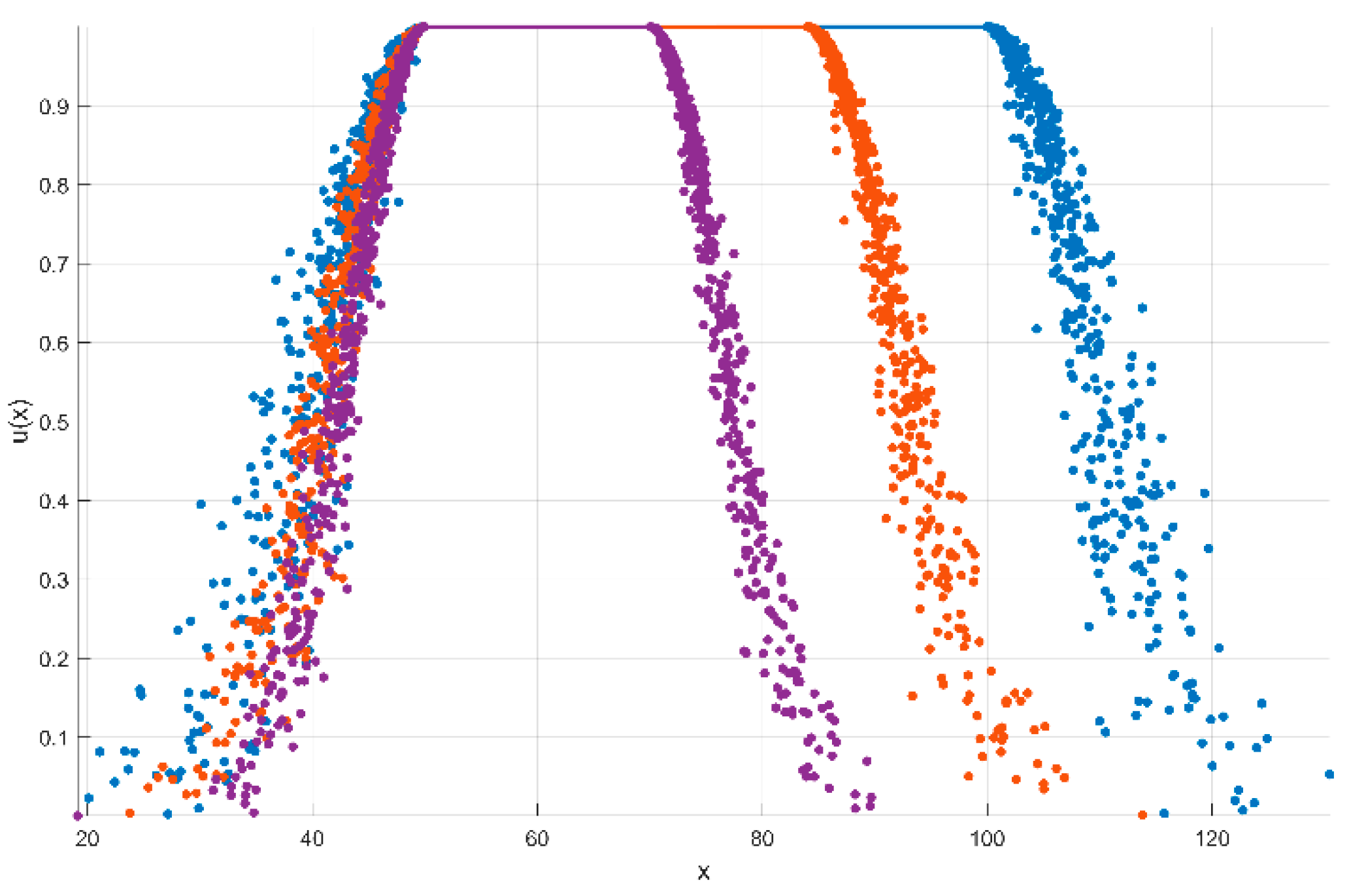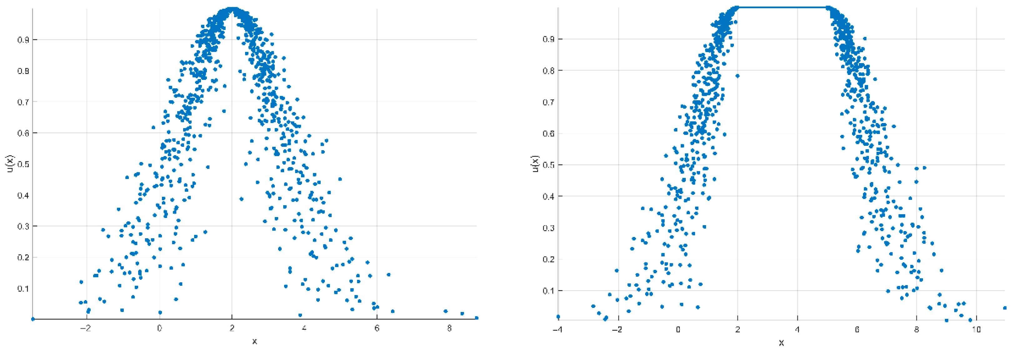 Figure 3. Trapezium clouds C ^ [ 0 , 1 ] 3 , C ^ [ 0 , 1 ] 5 , and C ^ [ 0 , 1 ] 7 with 1000 cloud droplets.