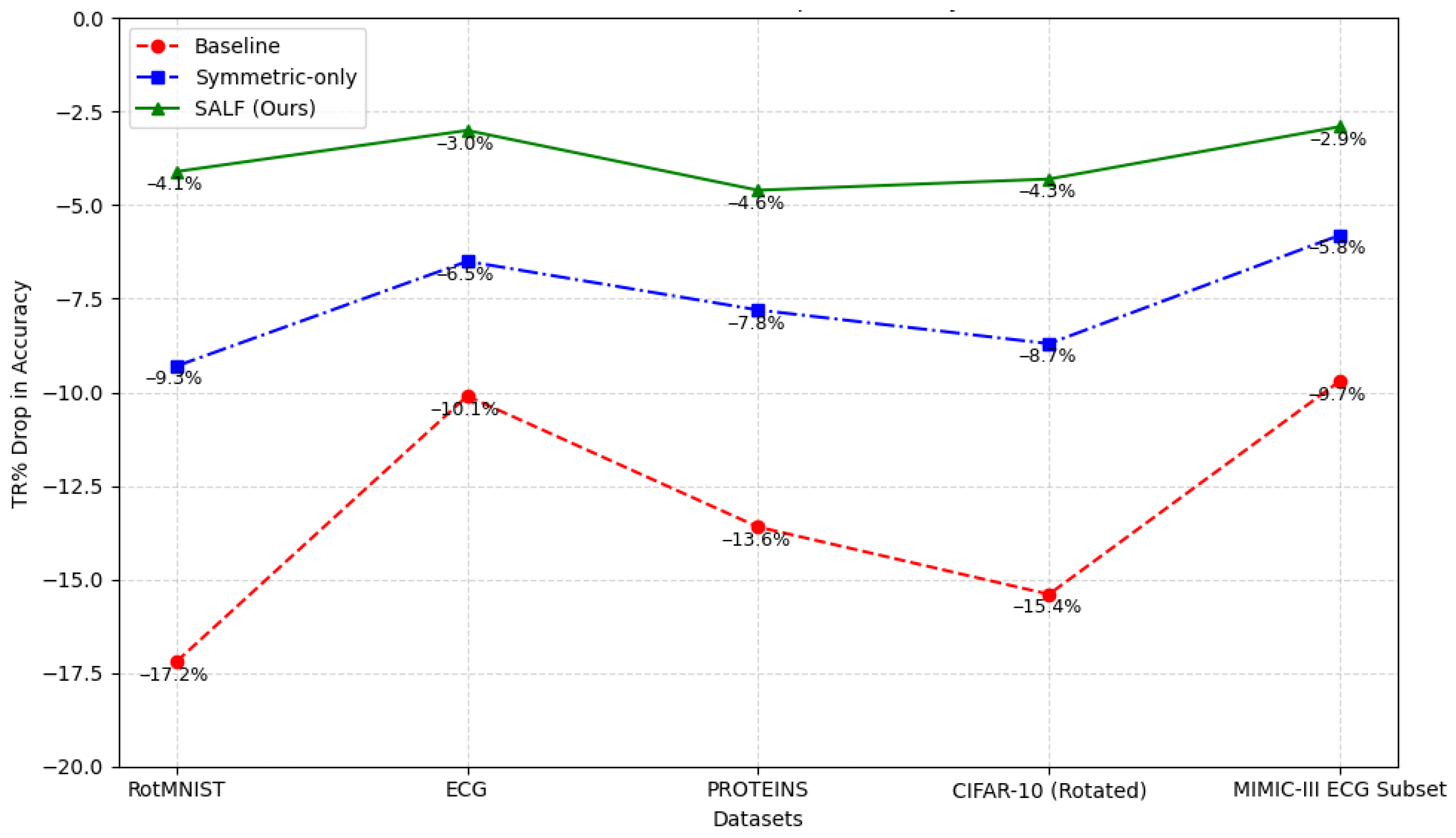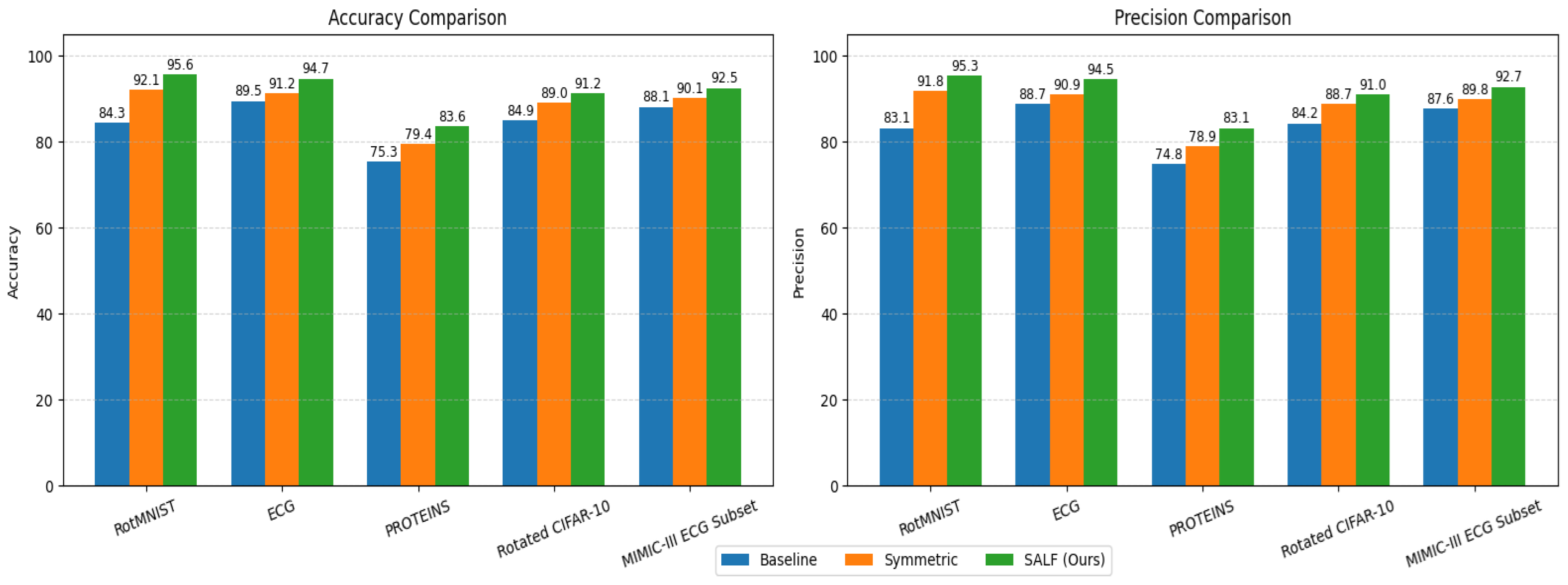 - Unified Multi-Domain Symmetry Handling—SALF encodes rotational, reflectional, permutation, and geometric invariances within a single modular framework, enabling deployment across images, sequences, graphs, and time-series signals without architecture redesign.