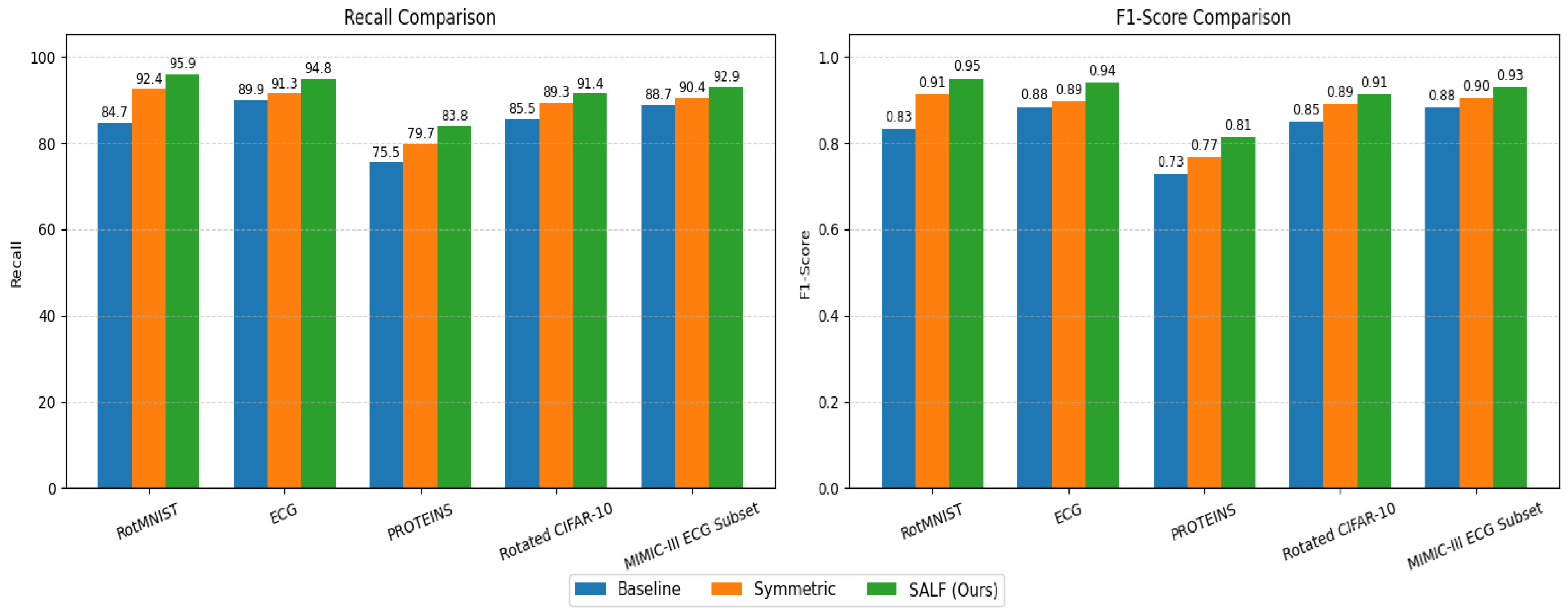 - SALF (Ours): Symmetry-aware encoder + asymmetry-driven optimization.