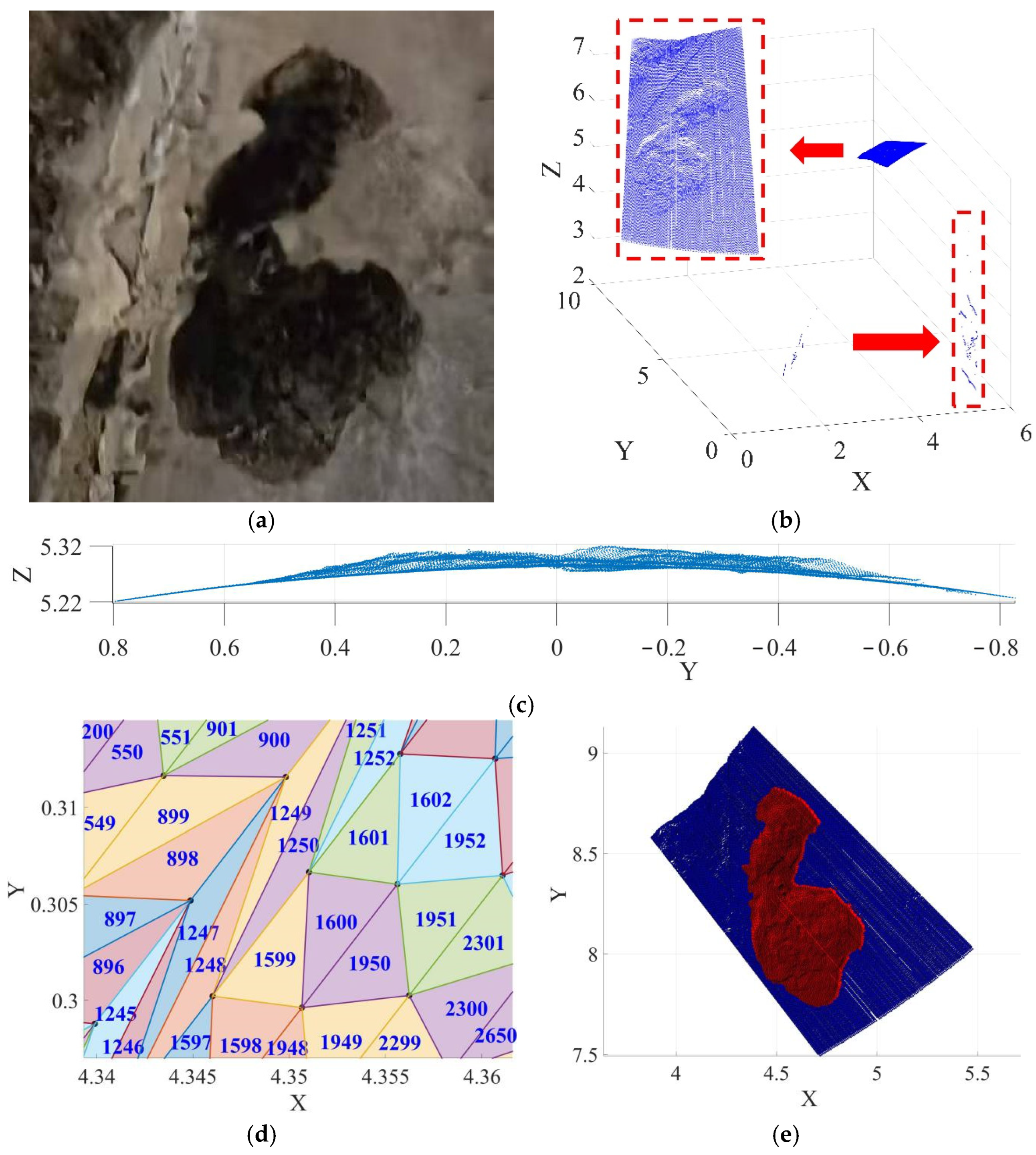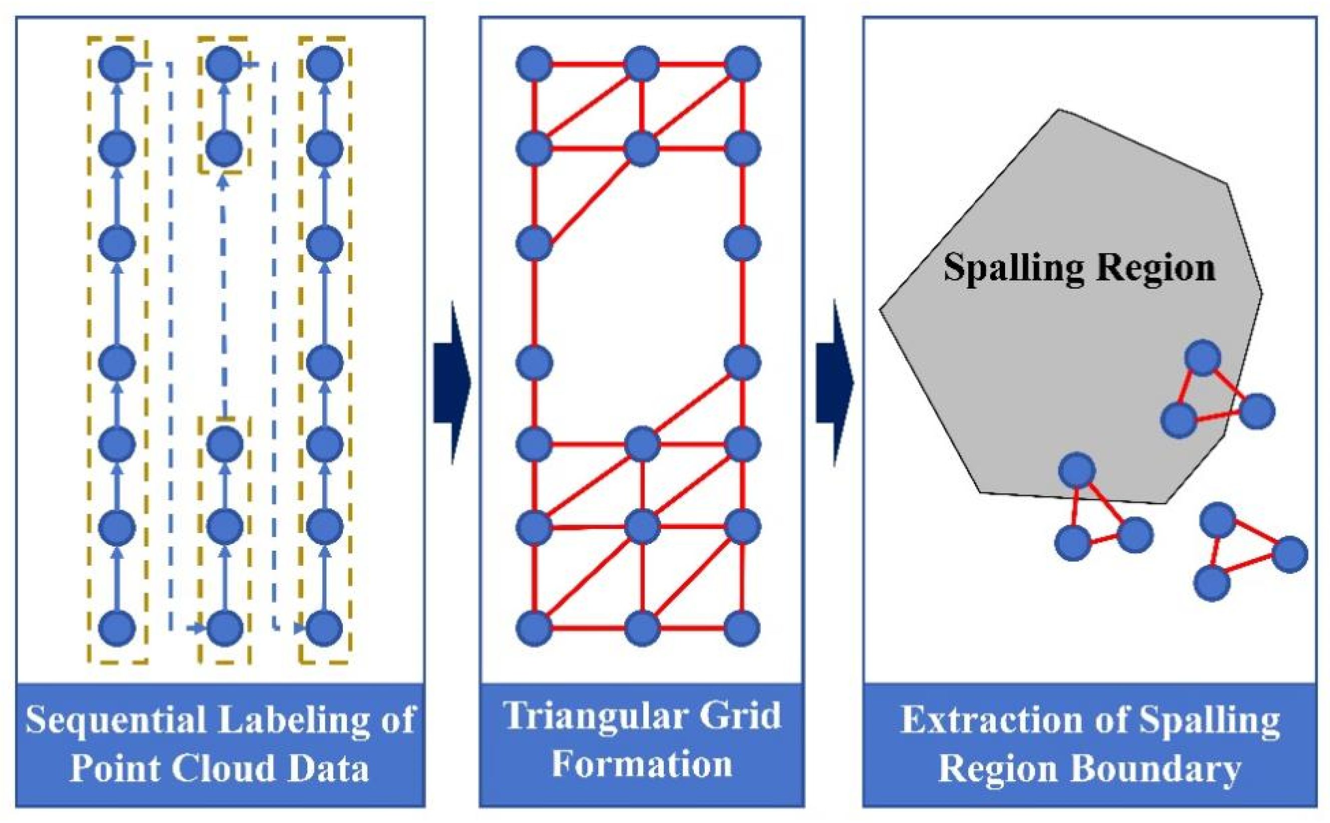 - Process: A triangulated mesh is generated from the point cloud P1 to establish surface connectivity. The variance of the curvature radius between adjacent mesh elements is computed. A predefined variation threshold is applied to segment and extract regions with high curvature variance, which correspond to spalling defects.