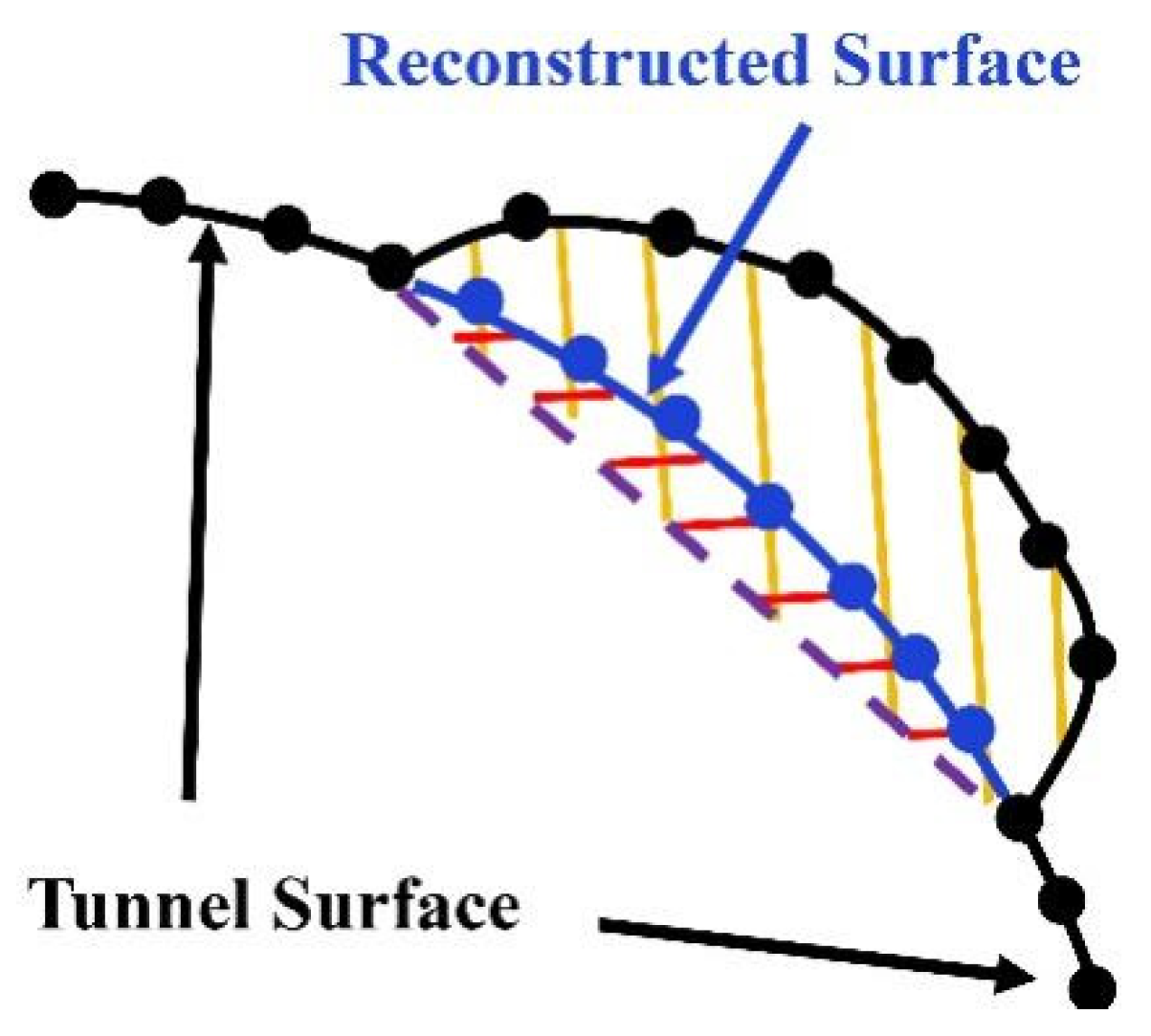 - Despite its effectiveness, the proposed method has certain limitations. First, the accuracy of volume estimation is sensitive to the scanning angle, as non-perpendicular angles may cause occlusions and incomplete data acquisition. Second, the method assumes that the tunnel cross-section consists of symmetrical circular arcs, which may not fully represent tunnels with irregular or non-standard geometries. Third, the computational efficiency of the mesh-based curvature analysis may decrease with very large-scale point clouds.