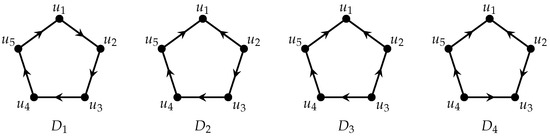 For any directed graph D, we denote by its reverse orientation, defined by . A key observation for our constructions is that each oriented pentagon (see Figure 1) is isomorphic to its reverse orientation, i.e., for all . This property ensures that the pair naturally forms a -decomposition of (the symmetric directed graph whose underlying simple graph is a 5-cycle). To see this, note that contains exactly 10 arcs (5 edges × 2 directions), while the union contains all 10 arcs of exactly once, since each arc in corresponds to in .