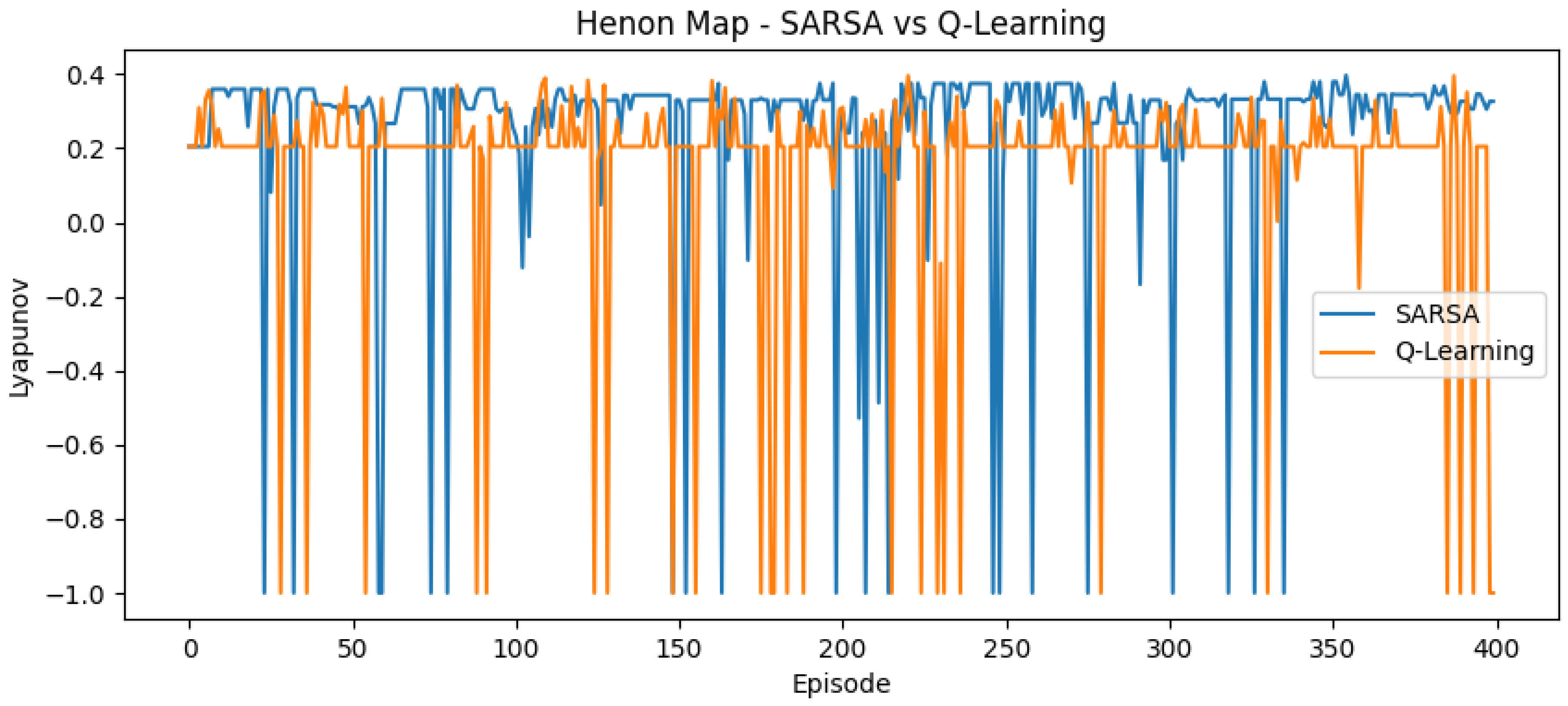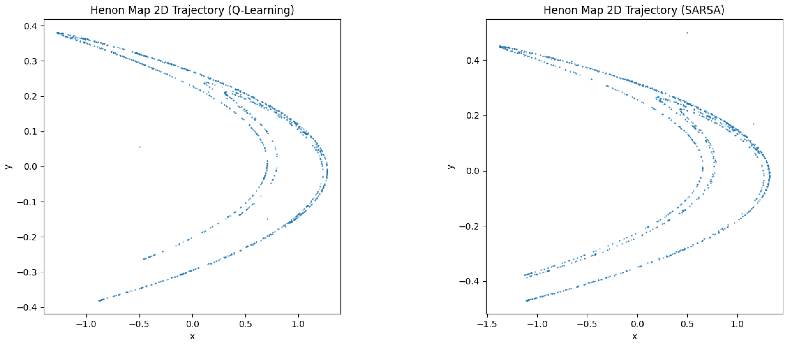 | Hénon Map (2D) | ≈200–300 | Correct | Similar; SARSA higher variance. |