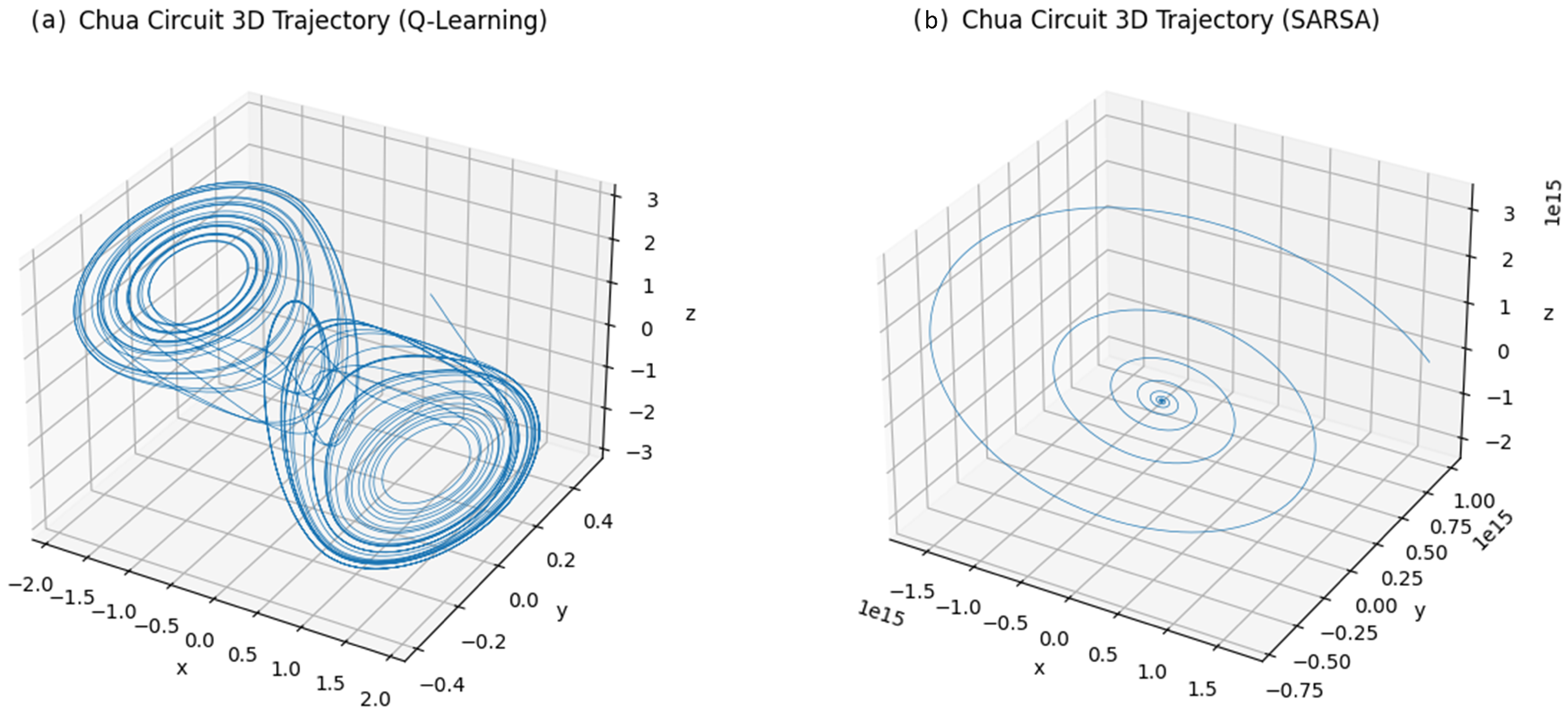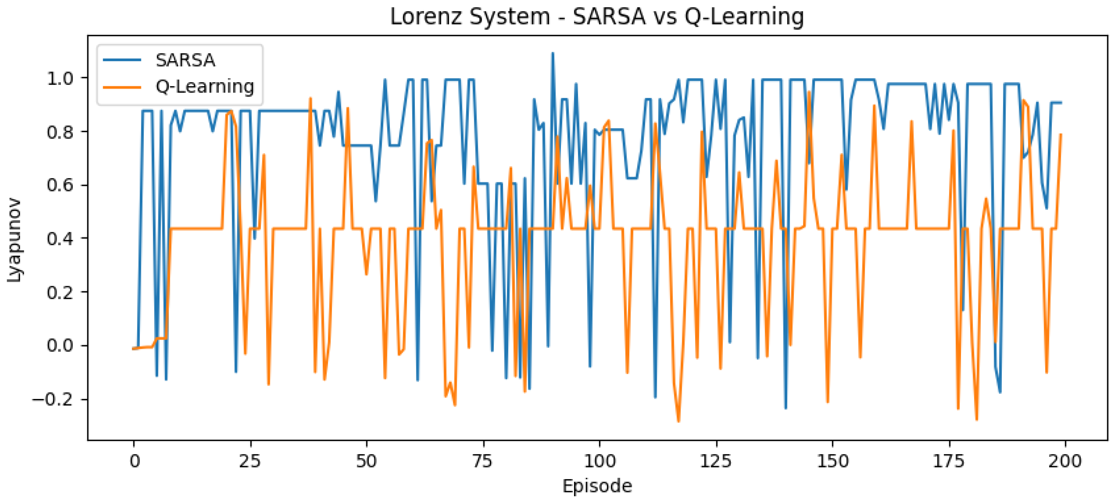 | Chua’s Circuit (3D) | ≈150–200 | Correct (Q-Learning), Failed (SARSA) | Q-learning found attractor; SARSA converged to fixed point. |